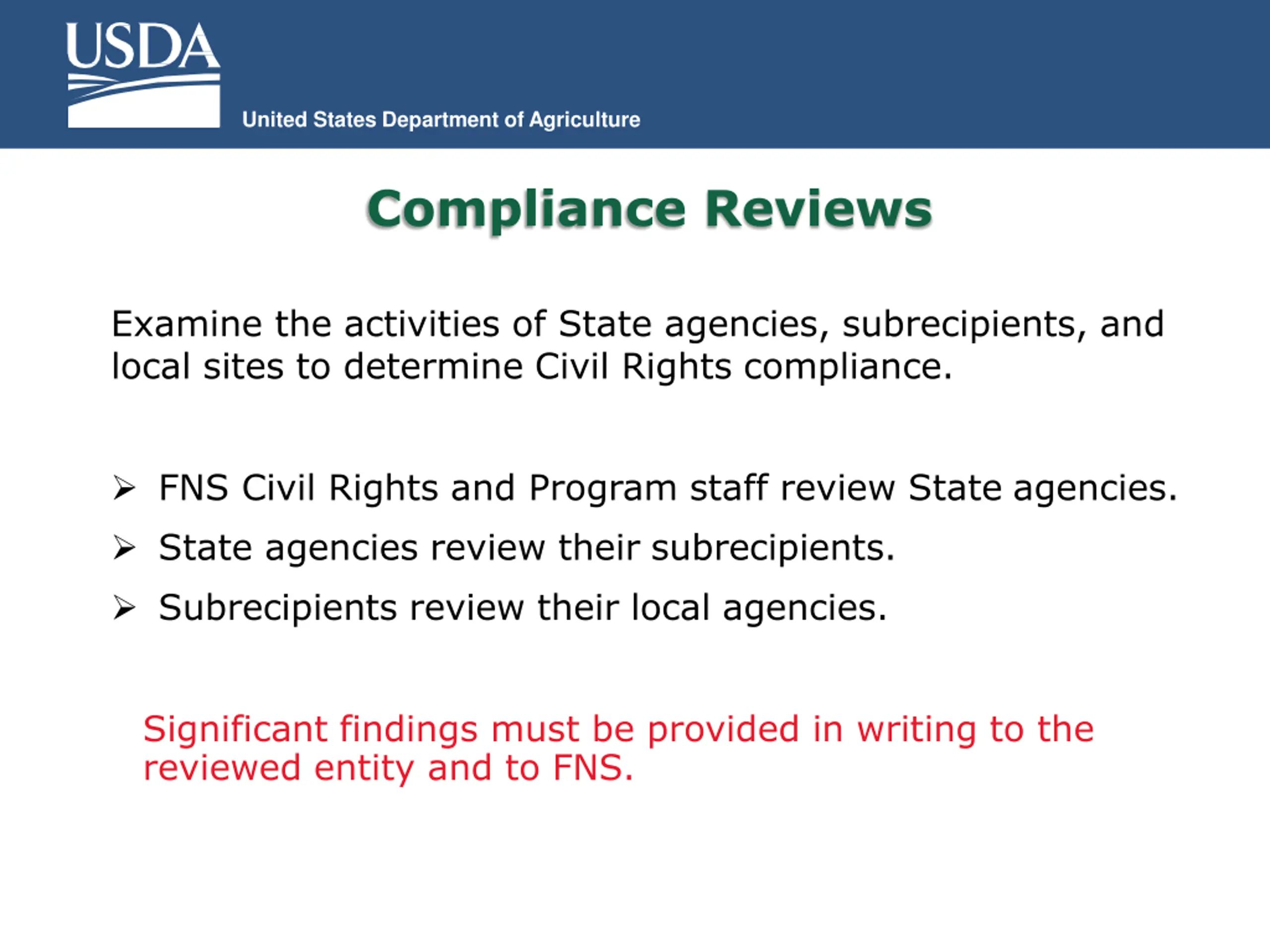 United States Department of Agriculture Compliance Reviews Examine the activities of State agencies, subrecipients, and local sites to determine Civil Rights compliance. FNS Civil Rights and Program staff review State agencies. State agencies review their subrecipients. Subrecipients review their local agencies. Significant findings must be provided in writing to the reviewed entity and to FNS.
