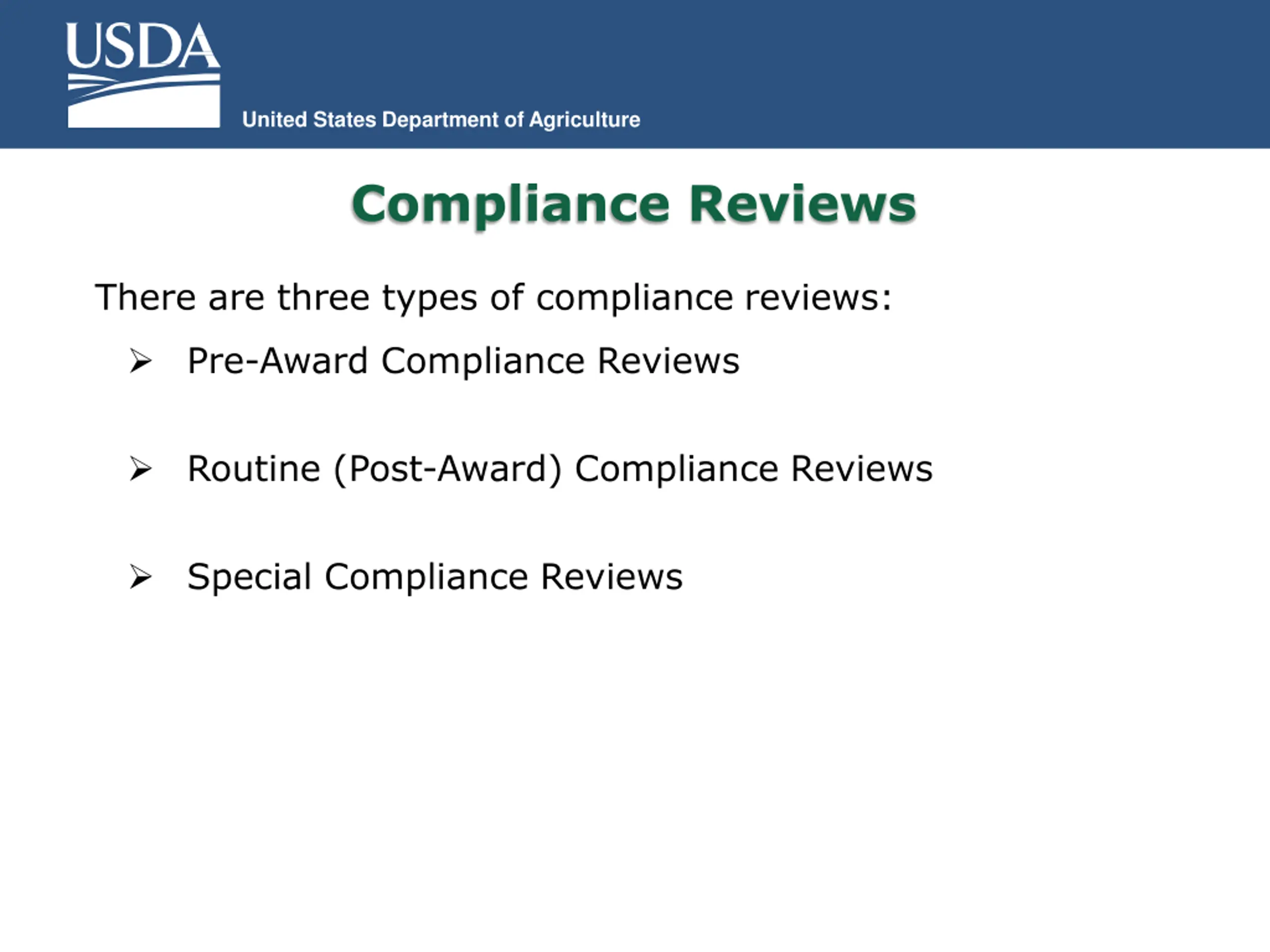United States Department of Agriculture Compliance Reviews There are three types of compliance reviews: Pre-Award Compliance Reviews Routine (Post-Award) Compliance Reviews Special Compliance Reviews