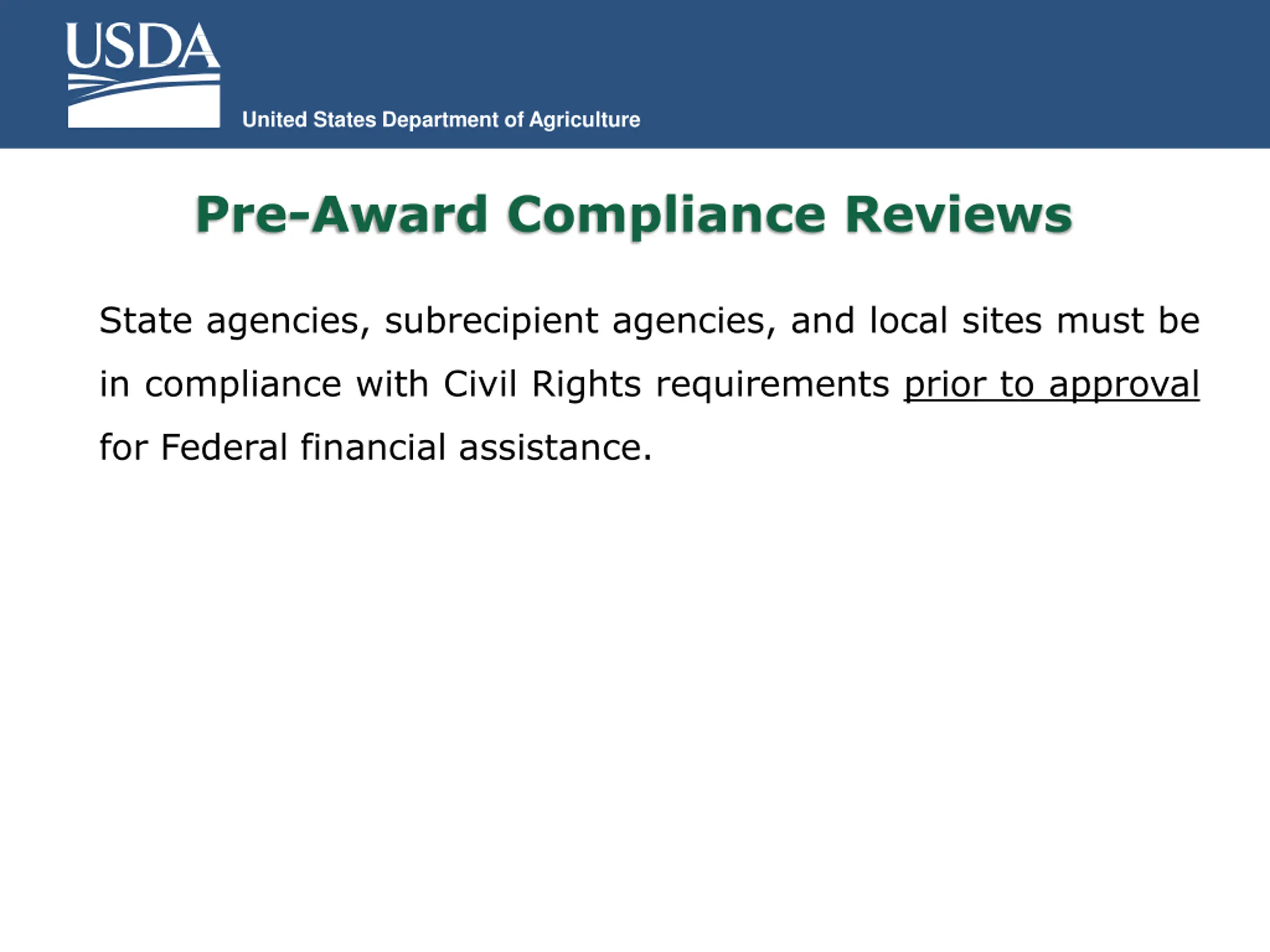 United States Department of Agriculture Pre-Award Compliance Reviews State agencies, subrecipient agencies, and local sites must be in compliance with Civil Rights requirements prior to approval for Federal financial assistance.
