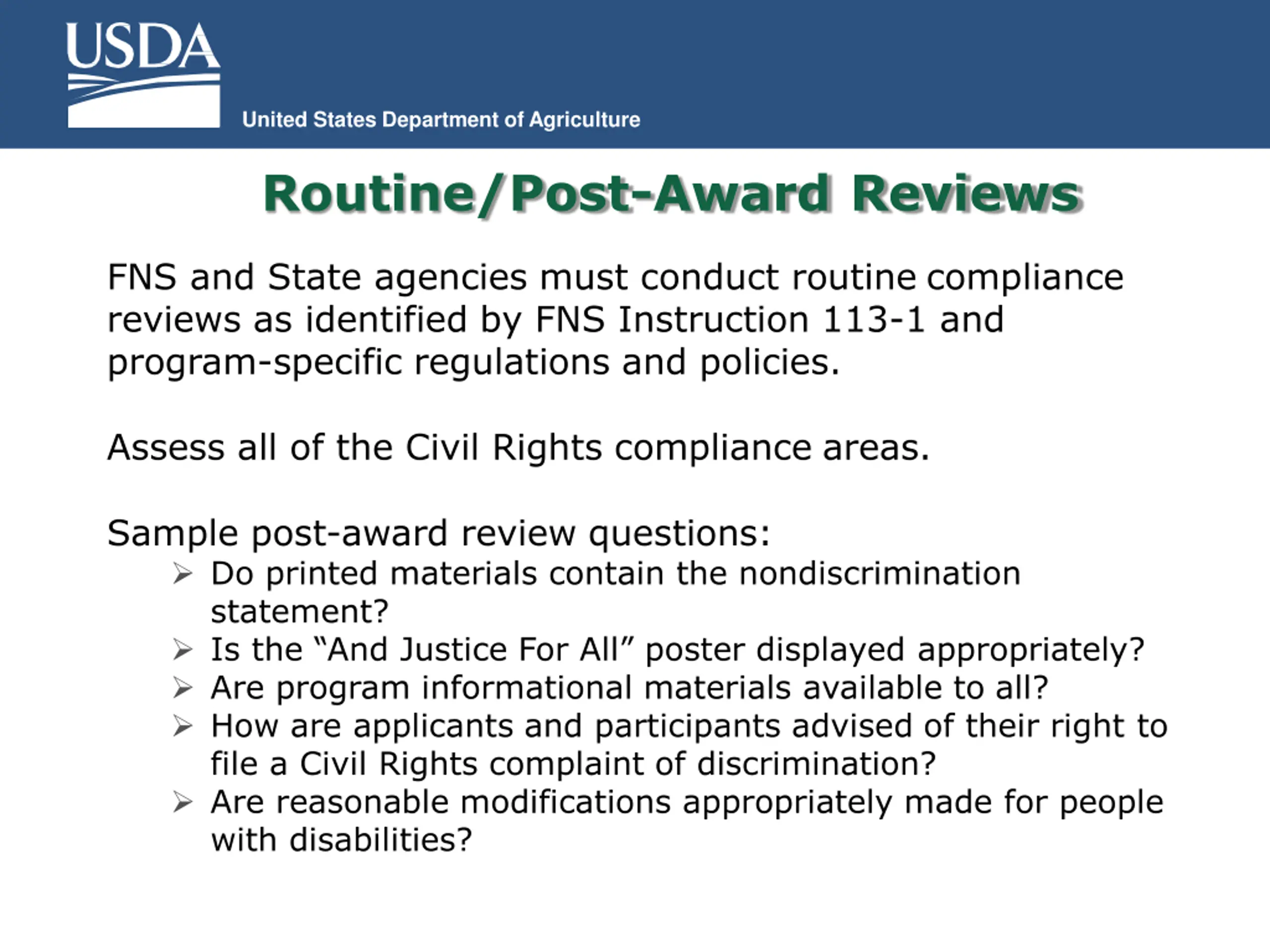 United States Department of Agriculture Routine/Post-Award Reviews FNS and State agencies must conduct routine compliance reviews as identified by FNS Instruction 113-1 and program-specific regulations and policies. Assess all of the Civil Rights compliance areas. Sample post-award review questions: Do printed materials contain the nondiscrimination statement? Is the And Justice For All poster displayed appropriately? Are program informational materials available to all? How are applicants and participants advised of their right to file a Civil Rights complaint of discrimination? Are reasonable modifications appropriately made for people with disabilities?