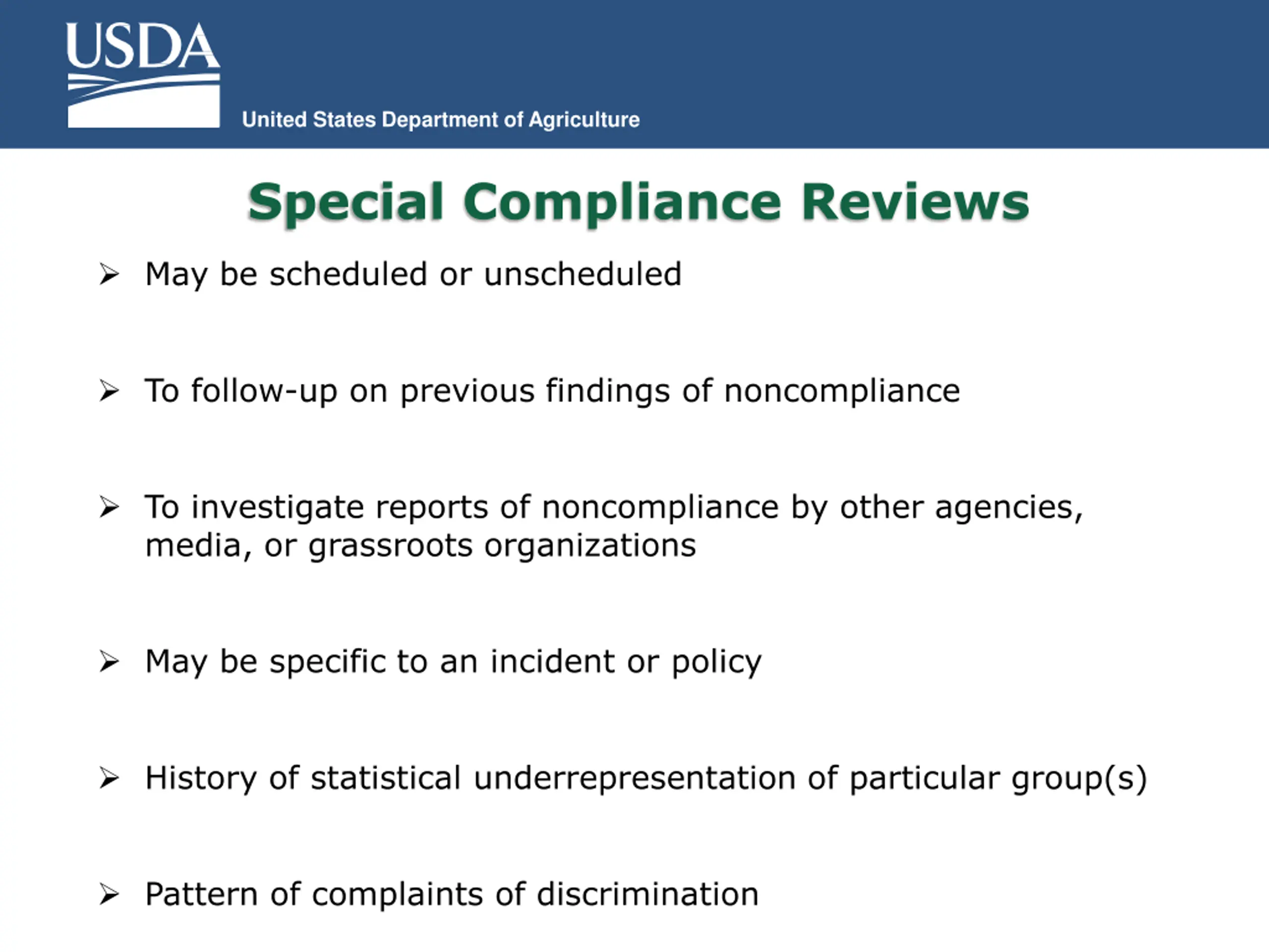 United States Department of Agriculture Special Compliance Reviews May be scheduled or unscheduled To follow-up on previous findings of noncompliance To investigate reports of noncompliance by other agencies, media, or grassroots organizations May be specific to an incident or policy History of statistical underrepresentation of particular group(s) Pattern of complaints of discrimination