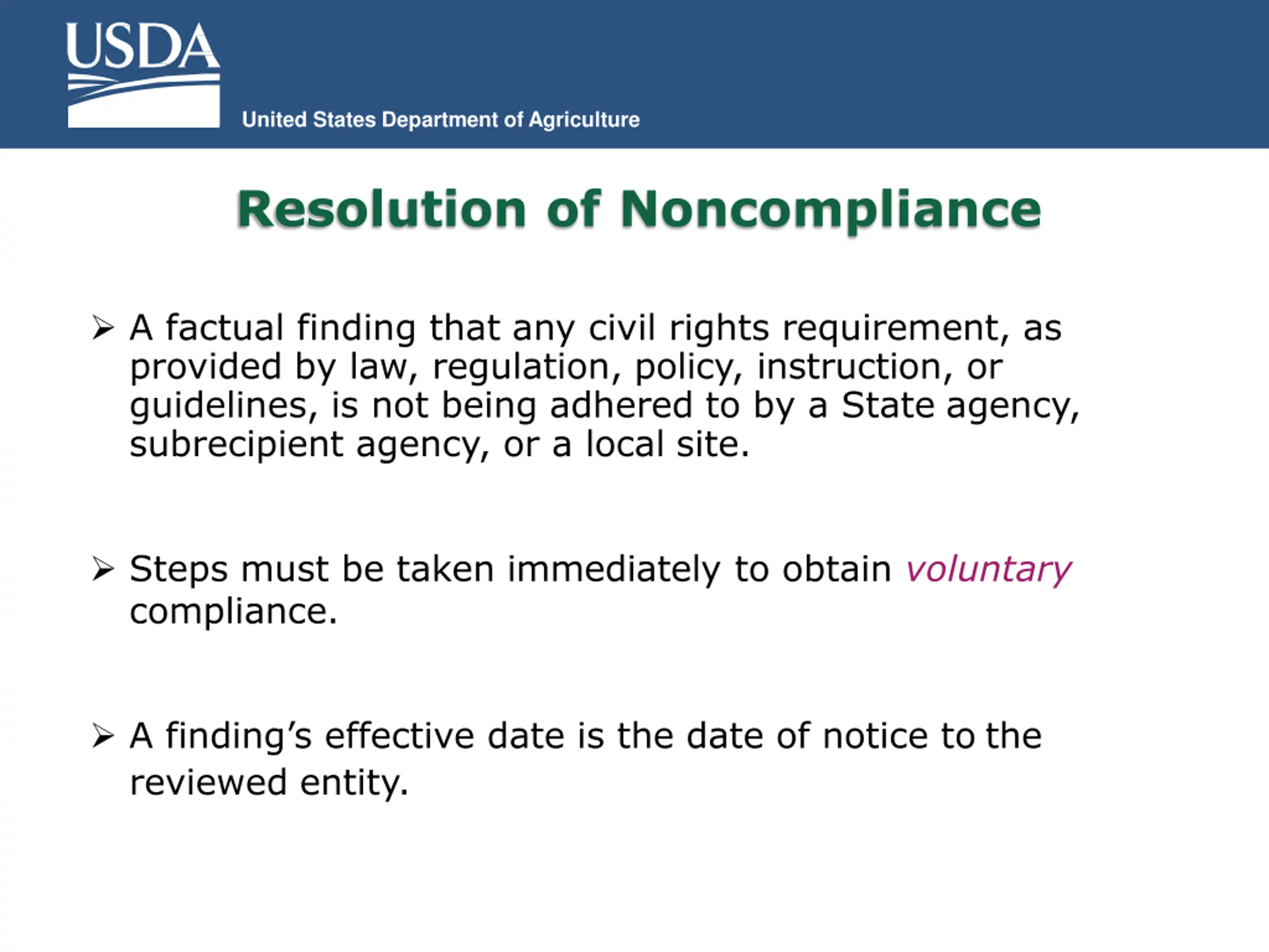United States Department of Agriculture Resolution of Noncompliance A factual finding that any civil rights requirement, as provided by law, regulation, policy, instruction, or guidelines, is not being adhered to by a State agency, subrecipient agency, or a local site. Steps must be taken immediately to obtain voluntary compliance. A finding s effective date is the date of notice to the reviewed entity.