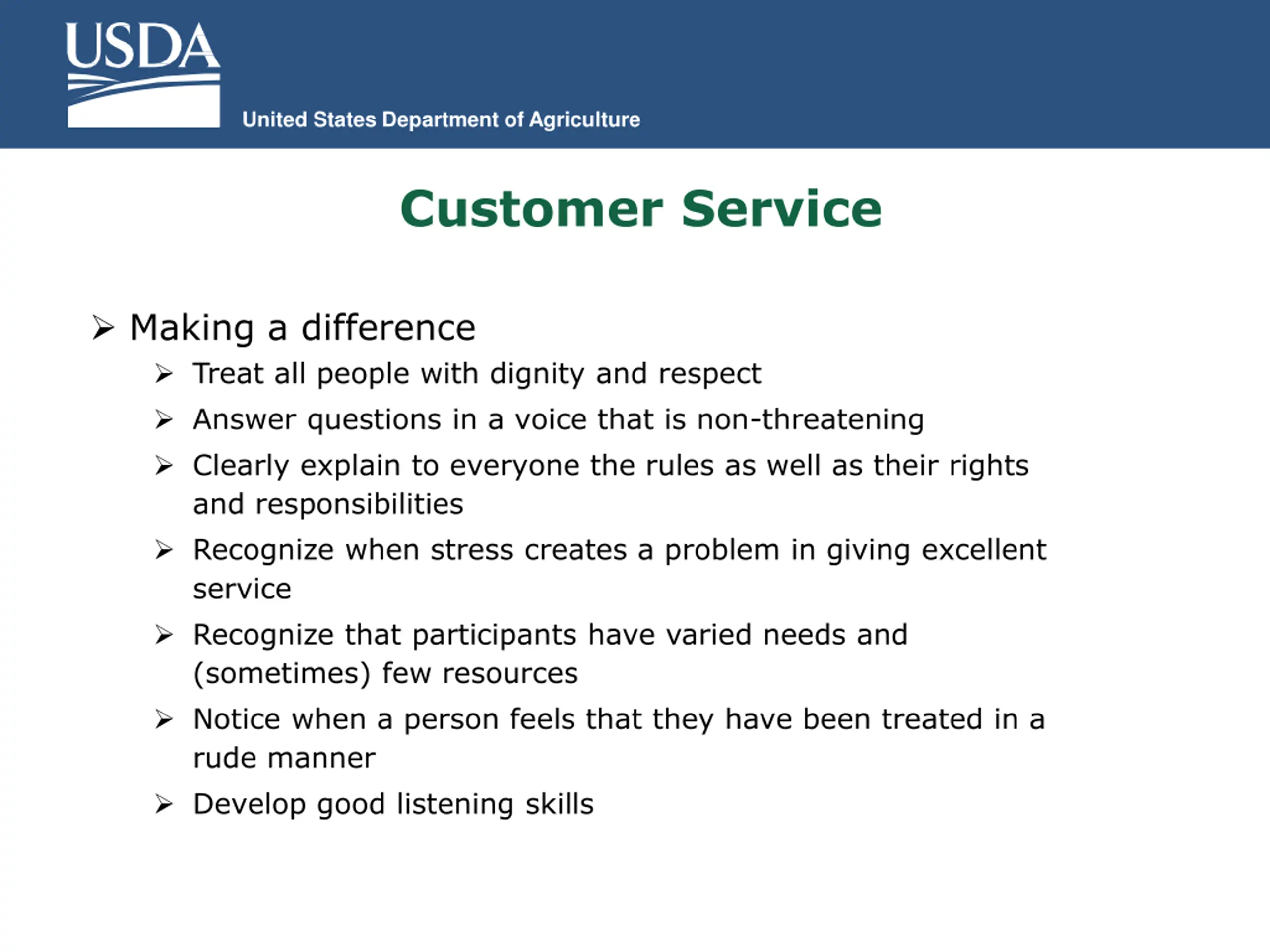 United States Department of Agriculture Customer Service Making a difference Treat all people with dignity and respect Answer questions in a voice that is non-threatening Clearly explain to everyone the rules as well as their rights and responsibilities Recognize when stress creates a problem in giving excellent service Recognize that participants have varied needs and (sometimes) few resources Notice when a person feels that they have been treated in a rude manner Develop good listening skills