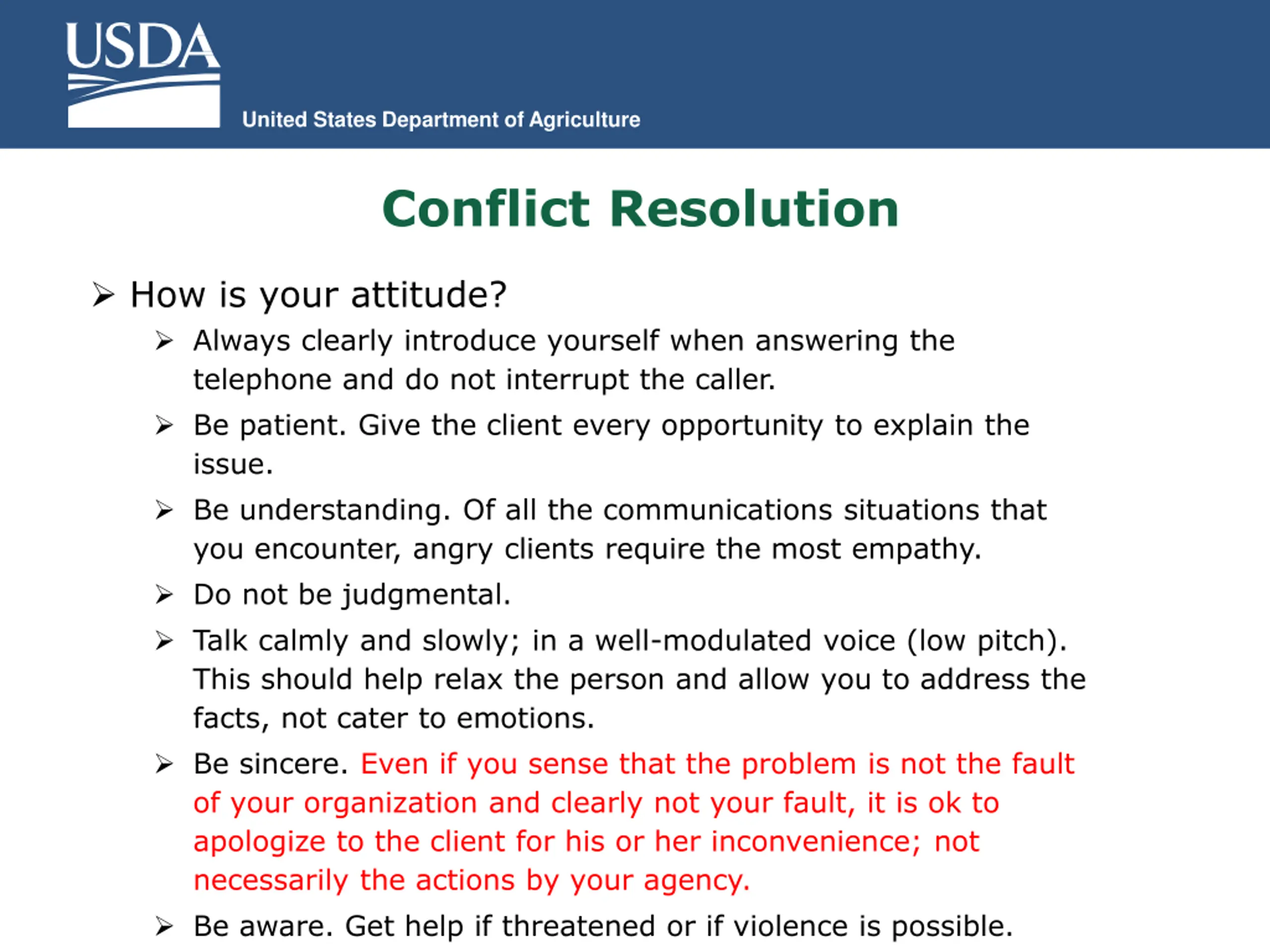 United States Department of Agriculture Conflict Resolution How is your attitude? Always clearly introduce yourself when answering the telephone and do not interrupt the caller. Be patient. Give the client every opportunity to explain the issue. Be understanding. Of all the communications situations that you encounter, angry clients require the most empathy. Do not be judgmental. Talk calmly and slowly; in a well-modulated voice (low pitch). This should help relax the person and allow you to address the facts, not cater to emotions. Be sincere. Even if you sense that the problem is not the fault of your organization and clearly not your fault, it is ok to apologize to the client for his or her inconvenience; not necessarily the actions by your agency. Be aware. Get help if threatened or if violence is possible.