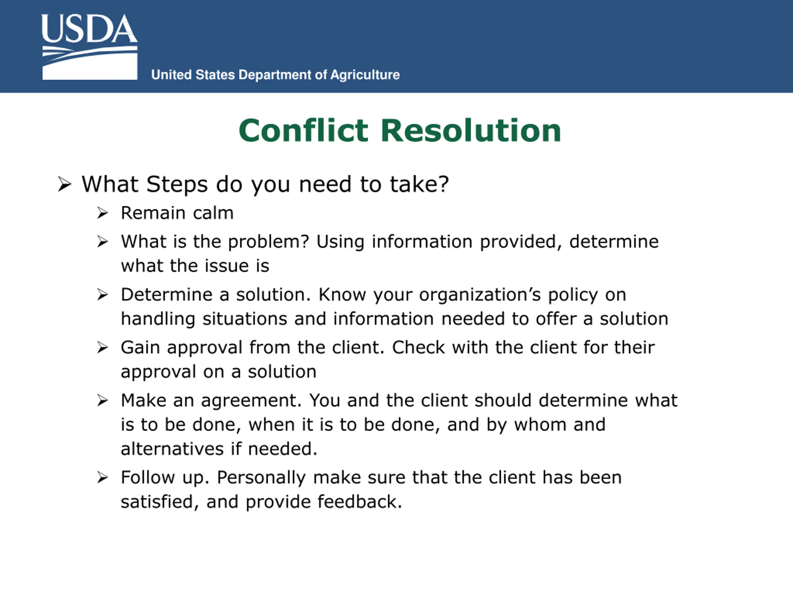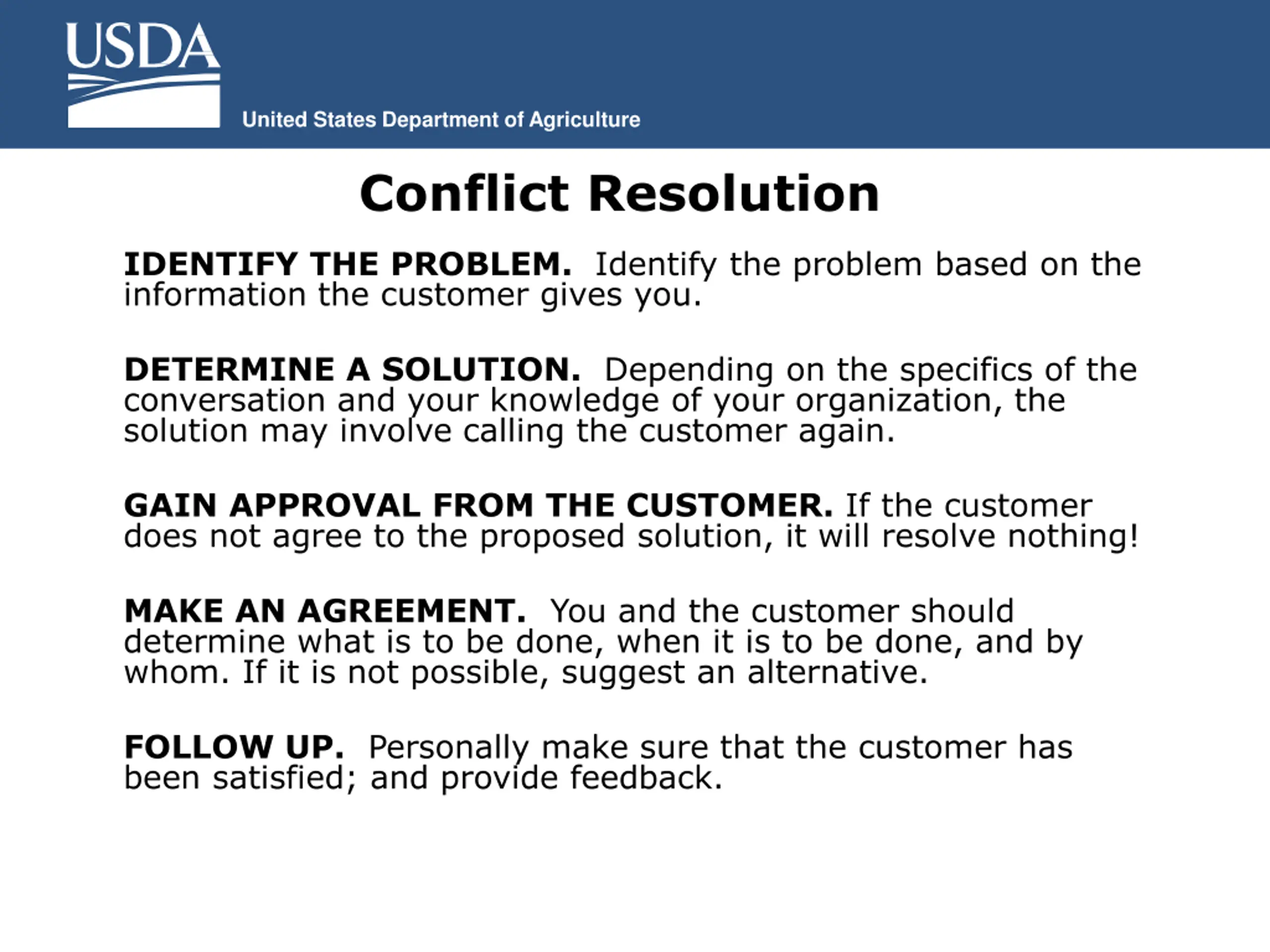 United States Department of Agriculture Conflict Resolution IDENTIFY THE PROBLEM. Identify the problem based on the information the customer gives you. DETERMINE A SOLUTION. Depending on the specifics of the conversation and your knowledge of your organization, the solution may involve calling the customer again. GAIN APPROVAL FROM THE CUSTOMER. If the customer does not agree to the proposed solution, it will resolve nothing! MAKE AN AGREEMENT. You and the customer should determine what is to be done, when it is to be done, and by whom. If it is not possible, suggest an alternative. FOLLOW UP. Personally make sure that the customer has been satisfied; and provide feedback.