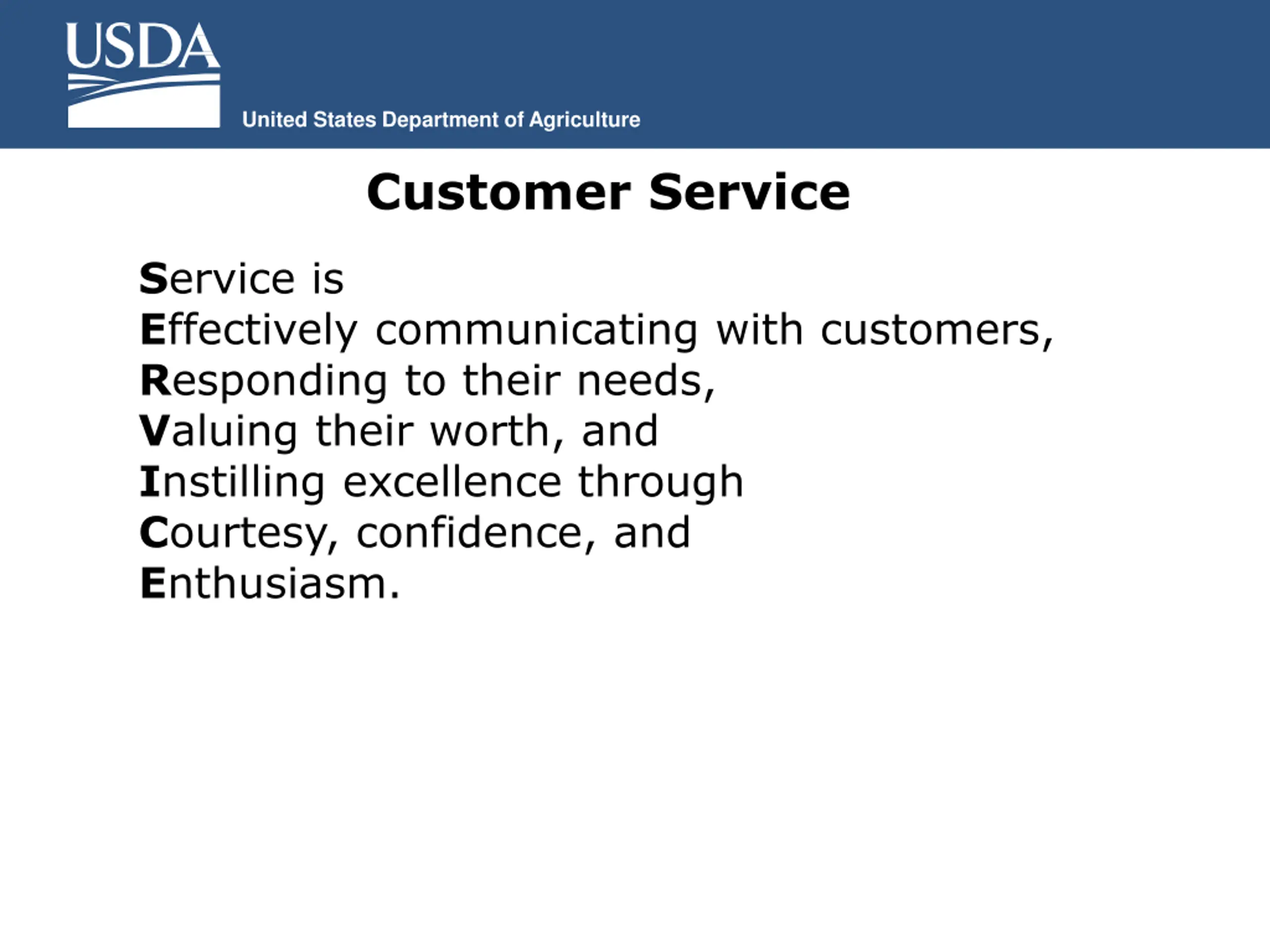 United States Department of Agriculture Customer Service Service is Effectively communicating with customers, Responding to their needs, Valuing their worth, and Instilling excellence through Courtesy, confidence, and Enthusiasm.