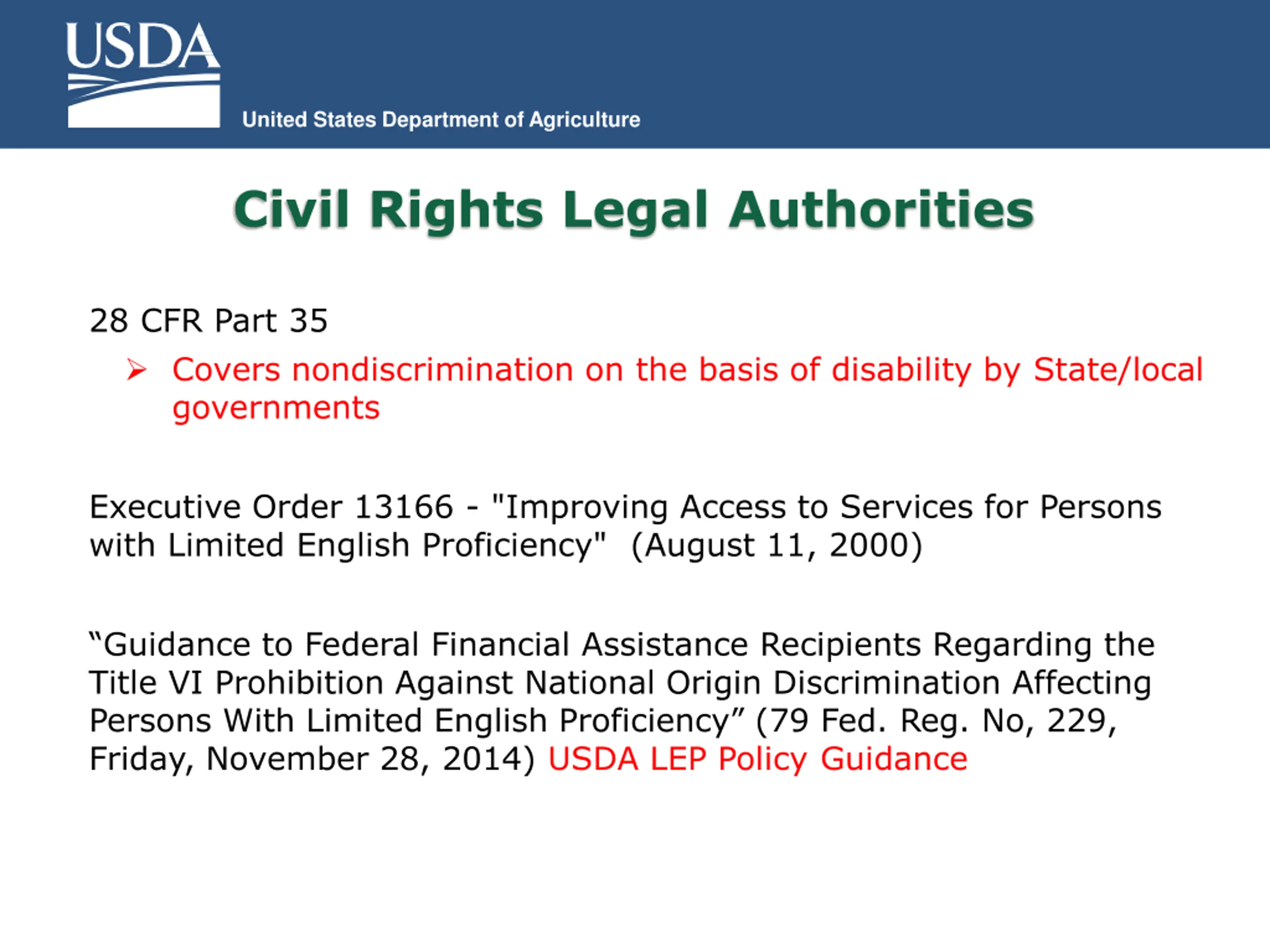 United States Department of Agriculture Civil Rights Legal Authorities 28 CFR Part 35 Covers nondiscrimination on the basis of disability by State/local governments Executive Order 13166 - "Improving Access to Services for Persons with Limited English Proficiency" (August 11, 2000) Guidance to Federal Financial Assistance Recipients Regarding the Title VI Prohibition Against National Origin Discrimination Affecting Persons With Limited English Proficiency (79 Fed. Reg. No, 229, Friday, November 28, 2014) USDA LEP Policy Guidance
