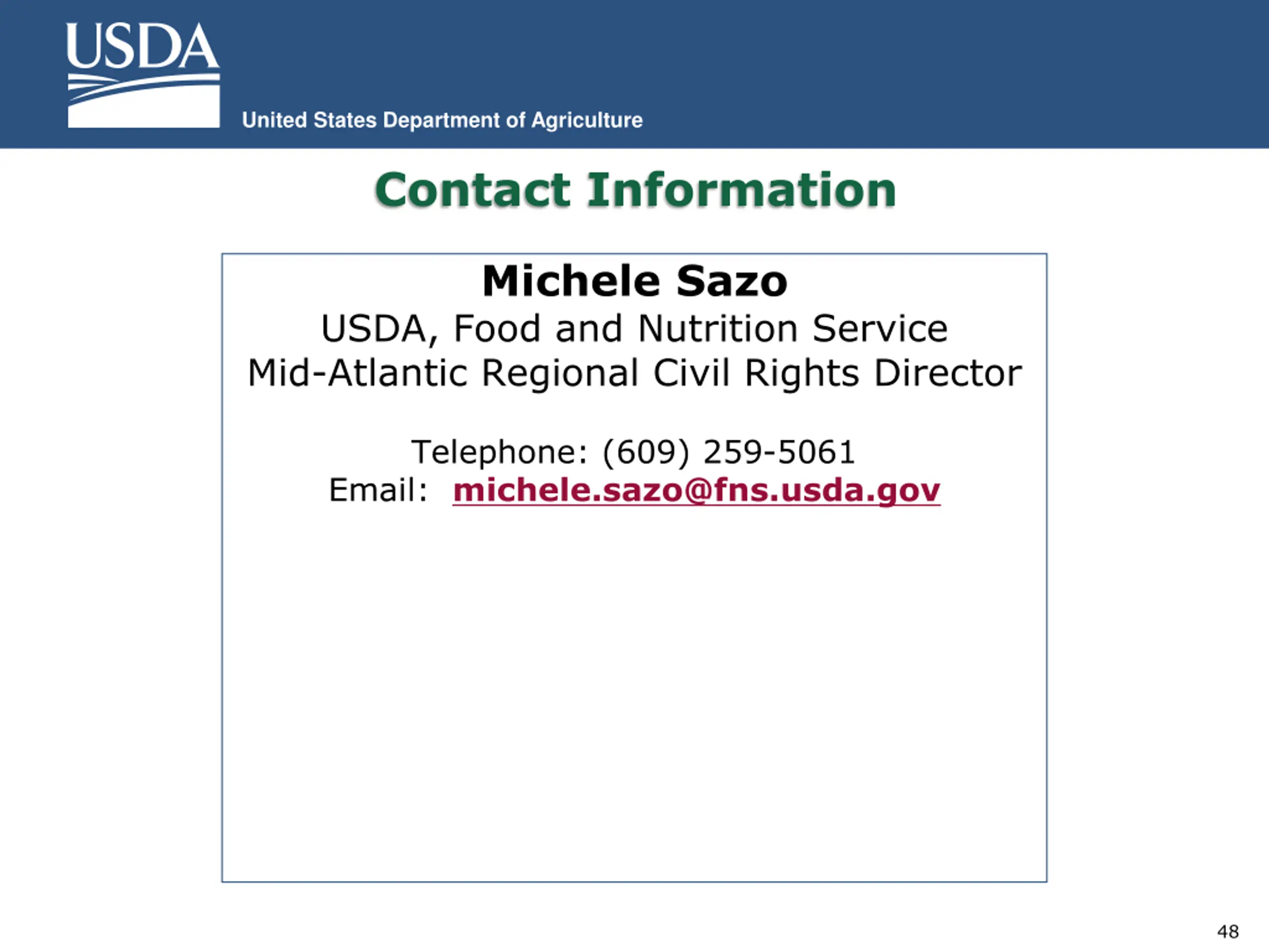 United States Department of Agriculture Contact Information Michele Sazo USDA, Food and Nutrition Service Mid-Atlantic Regional Civil Rights Director Telephone: (609) 259-5061 Email: michele.sazo@fns.usda.gov 48