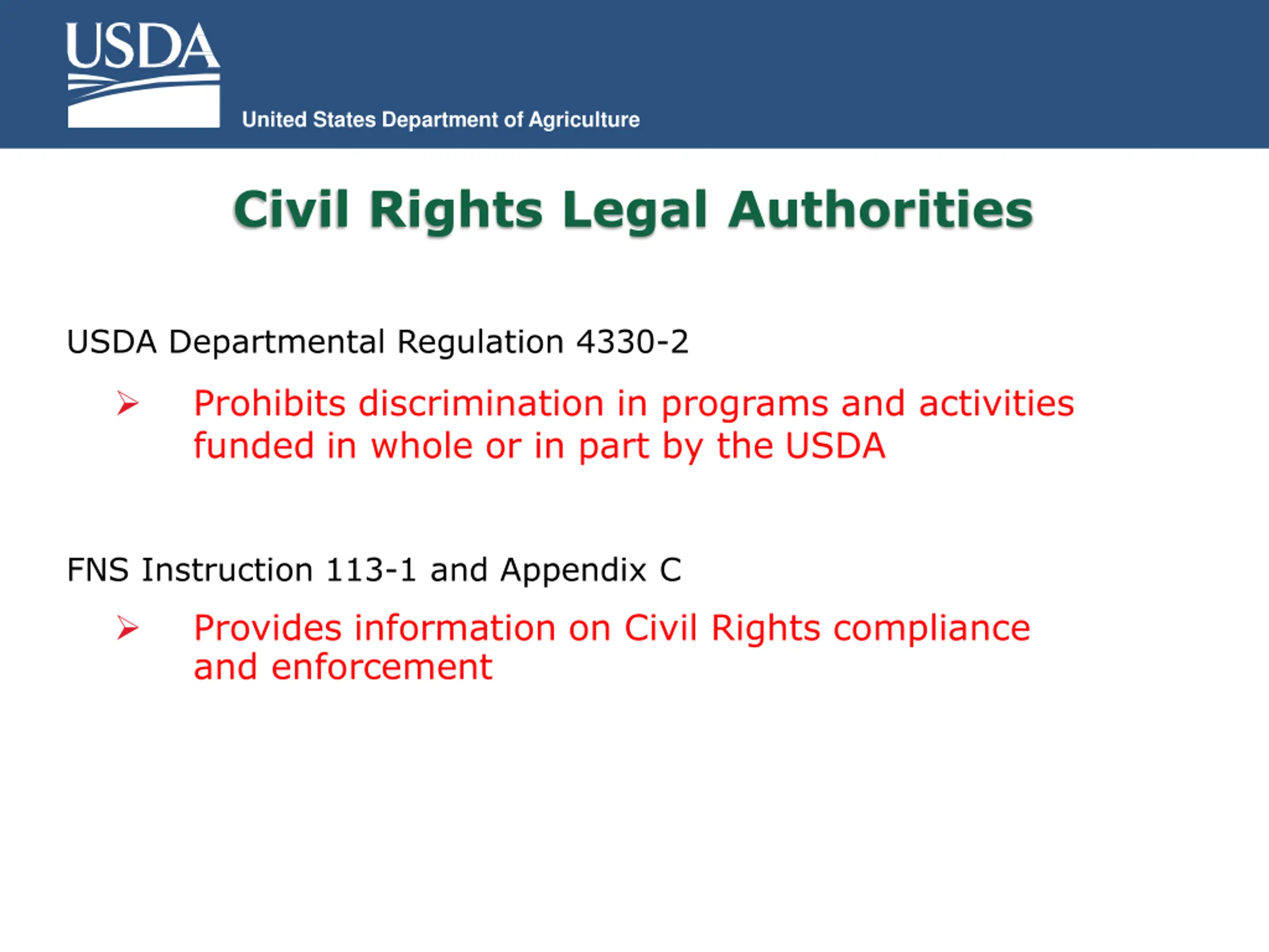 United States Department of Agriculture Civil Rights Legal Authorities USDA Departmental Regulation 4330-2 Prohibits discrimination in programs and activities funded in whole or in part by the USDA FNS Instruction 113-1 and Appendix C Provides information on Civil Rights compliance and enforcement