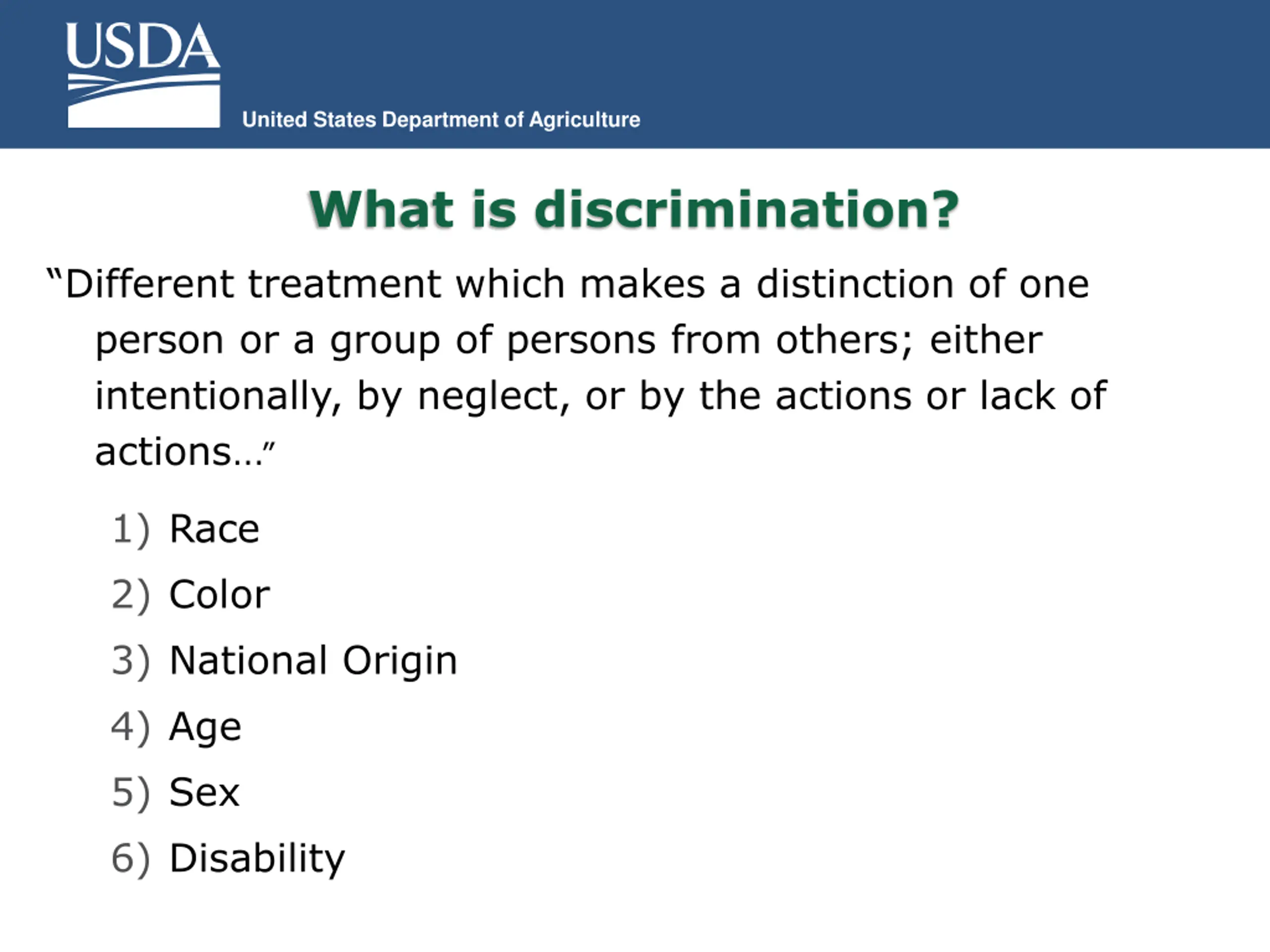 United States Department of Agriculture What is discrimination? Different treatment which makes a distinction of one person or a group of persons from others; either intentionally, by neglect, or by the actions or lack of actions... 1) Race 2) Color 3) National Origin 4) Age 5) Sex 6) Disability