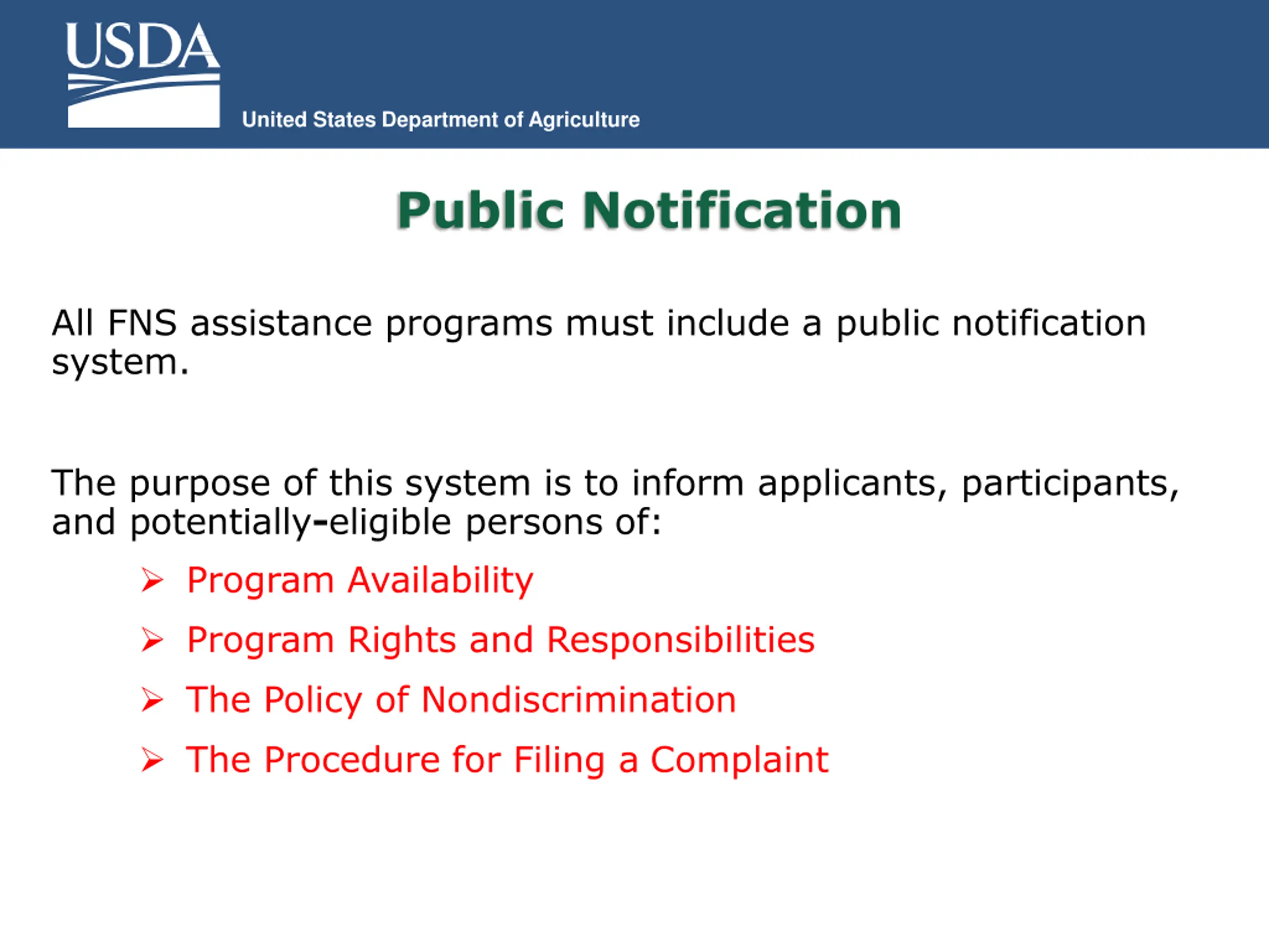 United States Department of Agriculture Public Notification All FNS assistance programs must include a public notification system. The purpose of this system is to inform applicants, participants, and potentially-eligible persons of: Program Availability Program Rights and Responsibilities The Policy of Nondiscrimination The Procedure for Filing a Complaint