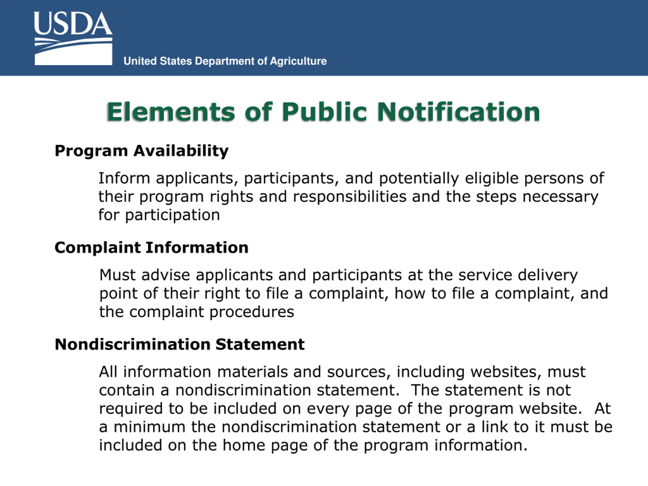 United States Department of Agriculture Elements of Public Notification Program Availability Inform applicants, participants, and potentially eligible persons of their program rights and responsibilities and the steps necessary for participation Complaint Information Must advise applicants and participants at the service delivery point of their right to file a complaint, how to file a complaint, and the complaint procedures Nondiscrimination Statement All information materials and sources, including websites, must contain a nondiscrimination statement. The statement is not required to be included on every page of the program website. At a minimum the nondiscrimination statement or a link to it must be included on the home page of the program information.
