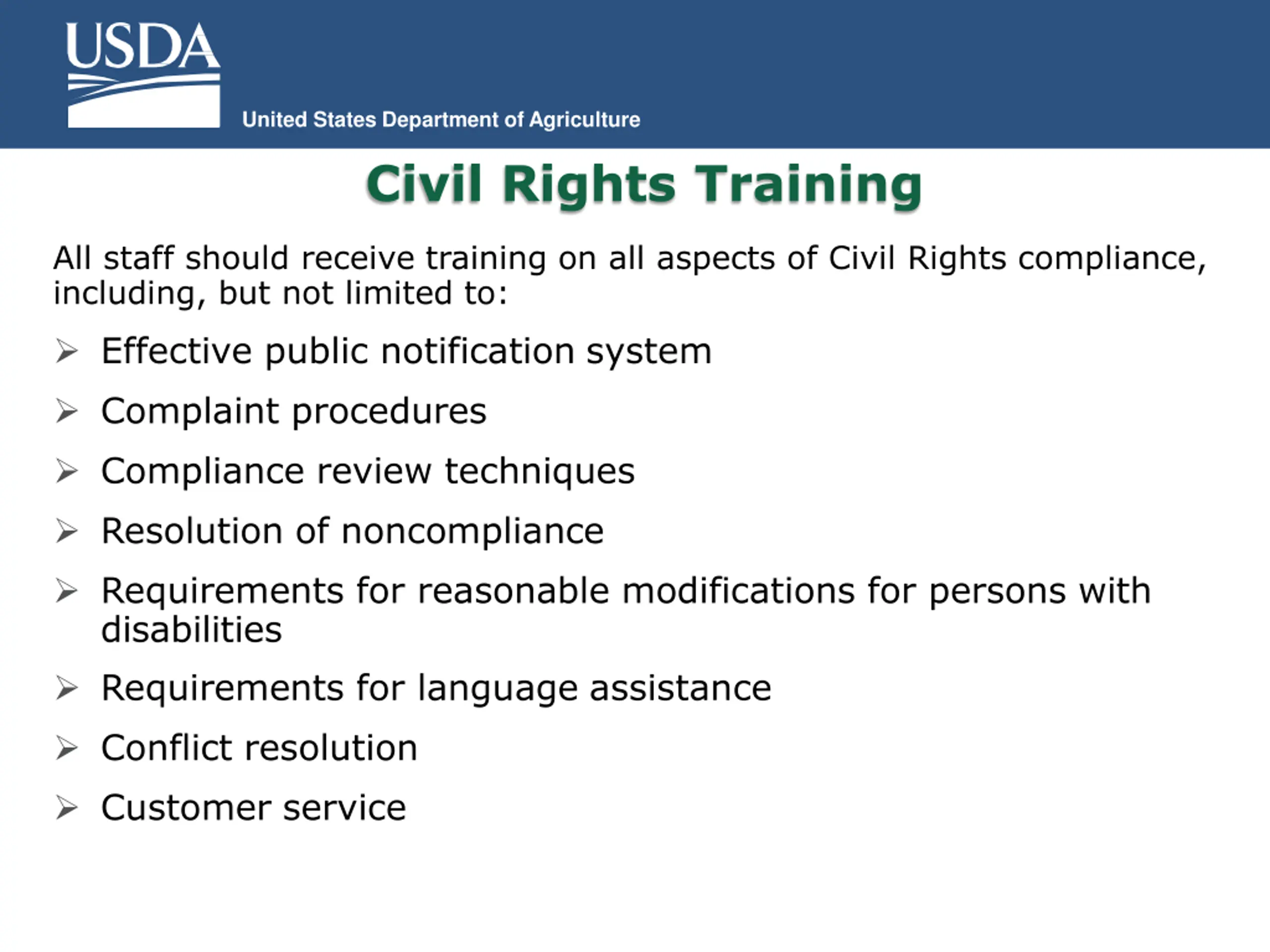 United States Department of Agriculture Civil Rights Training All staff should receive training on all aspects of Civil Rights compliance, including, but not limited to: Effective public notification system Complaint procedures Compliance review techniques Resolution of noncompliance Requirements for reasonable modifications for persons with disabilities Requirements for language assistance Conflict resolution Customer service