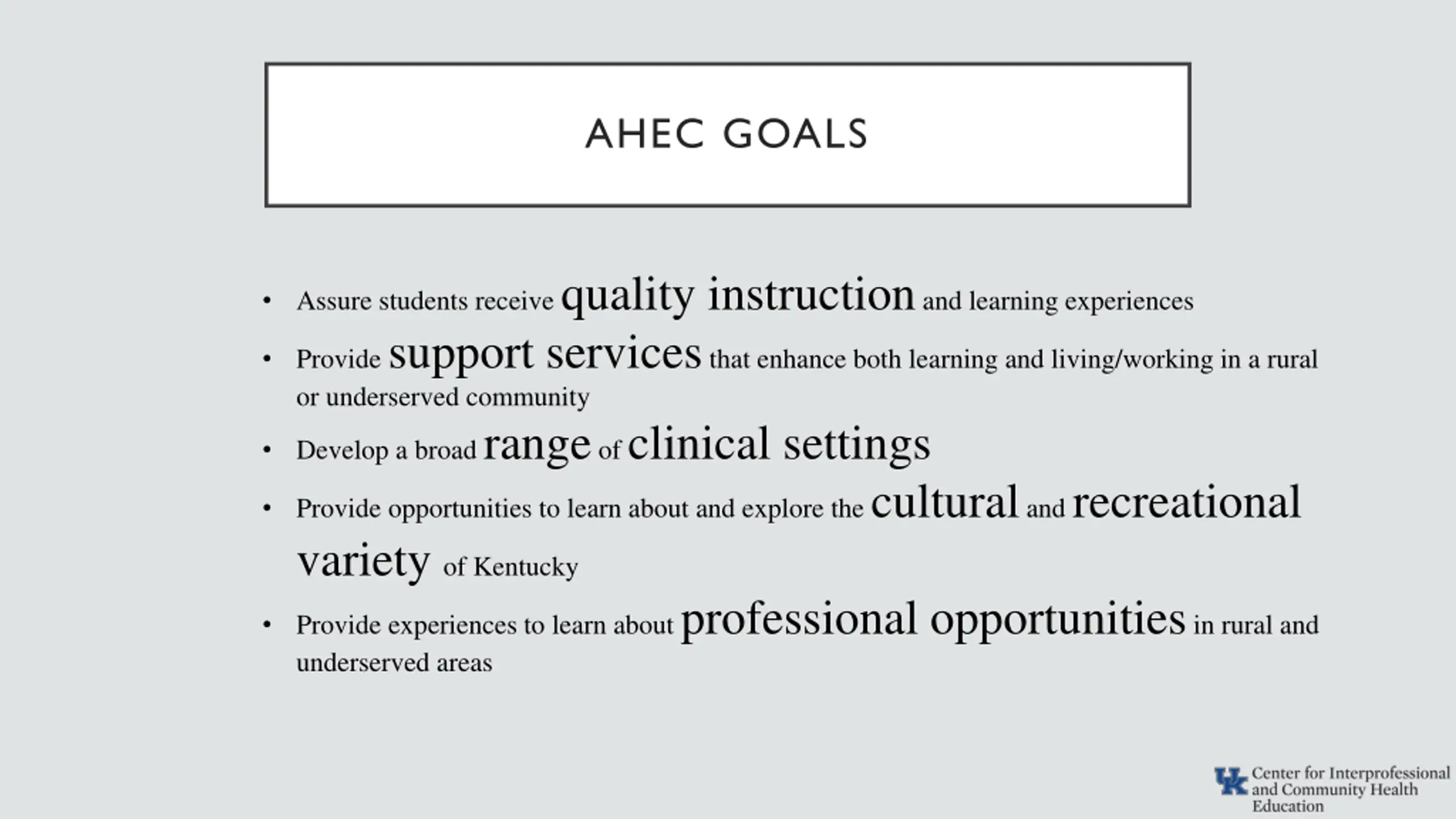 AHEC GOALS Assure students receive quality instruction and learning experiences Provide support services that enhance both learning and living/working in a rural or underserved community Develop a broad range of clinical settings Provide opportunities to learn about and explore the cultural and recreational variety of Kentucky Provide experiences to learn about professional opportunities in rural and underserved areas
