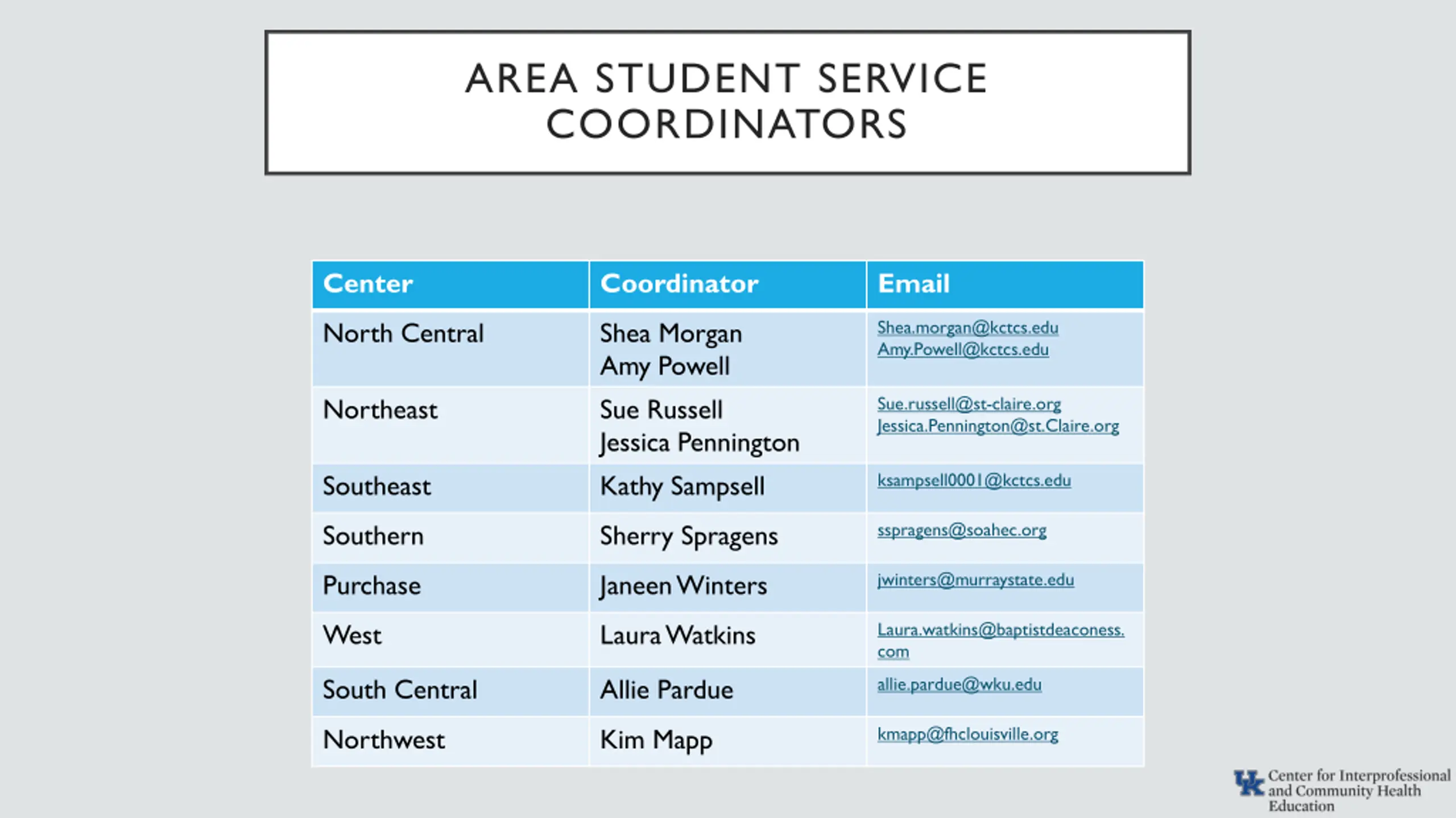 AREA STUDENT SERVICE COORDINATORS Center Coordinator Email Shea.morgan@kctcs.edu Amy.Powell@kctcs.edu North Central Shea Morgan Amy Powell Sue Russell Jessica Pennington Kathy Sampsell Sue.russell@st-claire.org Jessica.Pennington@st.Claire.org Northeast ksampsell0001@kctcs.edu Southeast sspragens@soahec.org Southern Sherry Spragens jwinters@murraystate.edu Purchase Janeen Winters Laura.watkins@baptistdeaconess. com West Laura Watkins allie.pardue@wku.edu South Central Allie Pardue kmapp@fhclouisville.org Northwest Kim Mapp