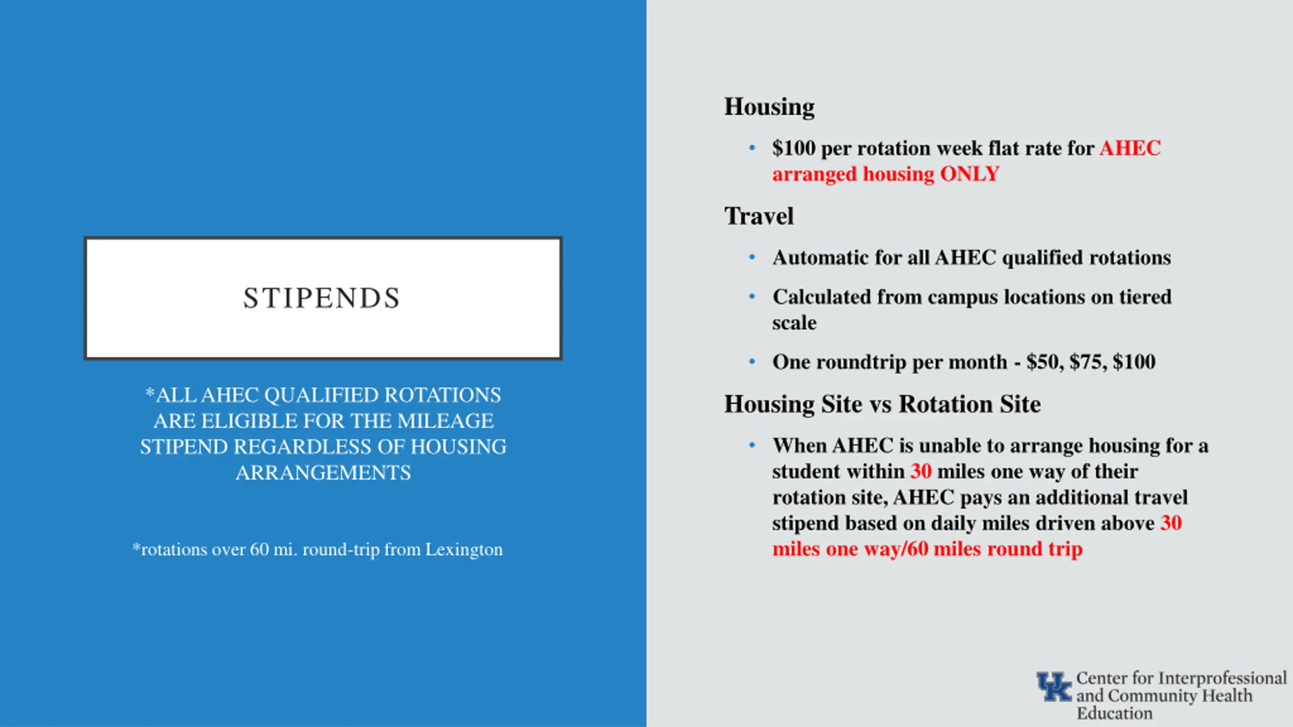 Housing $100 per rotation week flat rate for AHEC arranged housing ONLY Travel Automatic for all AHEC qualified rotations STIPENDS Calculated from campus locations on tiered scale One roundtrip per month - $50, $75, $100 *ALL AHEC QUALIFIED ROTATIONS ARE ELIGIBLE FOR THE MILEAGE STIPEND REGARDLESS OF HOUSING ARRANGEMENTS Housing Site vs Rotation Site When AHEC is unable to arrange housing for a student within 30 miles one way of their rotation site, AHEC pays an additional travel stipend based on daily miles driven above 30 miles one way/60 miles round trip *rotations over 60 mi. round-trip from Lexington