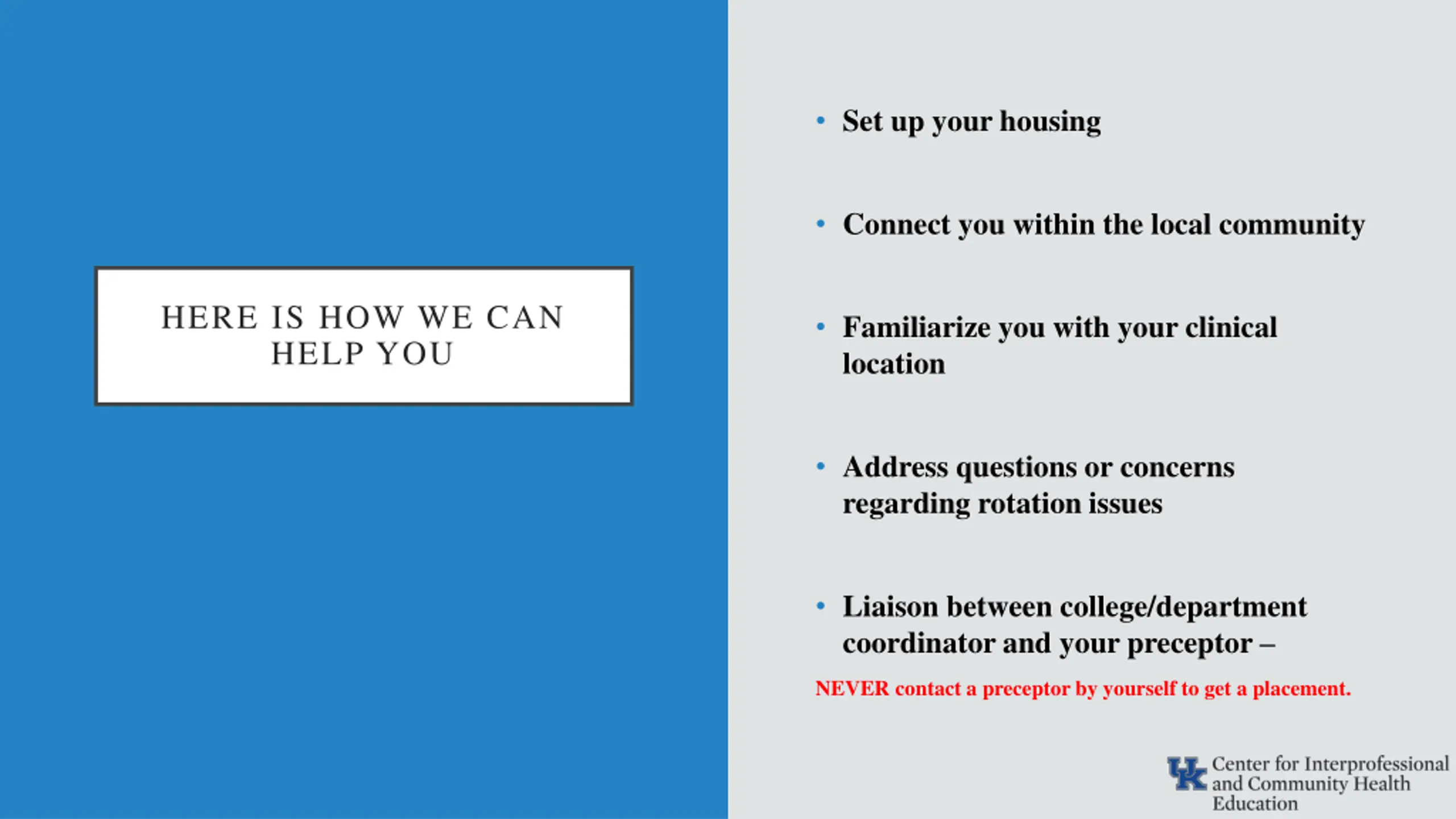 Set up your housing Connect you within the local community HERE IS HOW WE CAN HELP YOU Familiarize you with your clinical location Address questions or concerns regarding rotation issues Liaison between college/department coordinator and your preceptor NEVER contact a preceptor by yourself to get a placement.