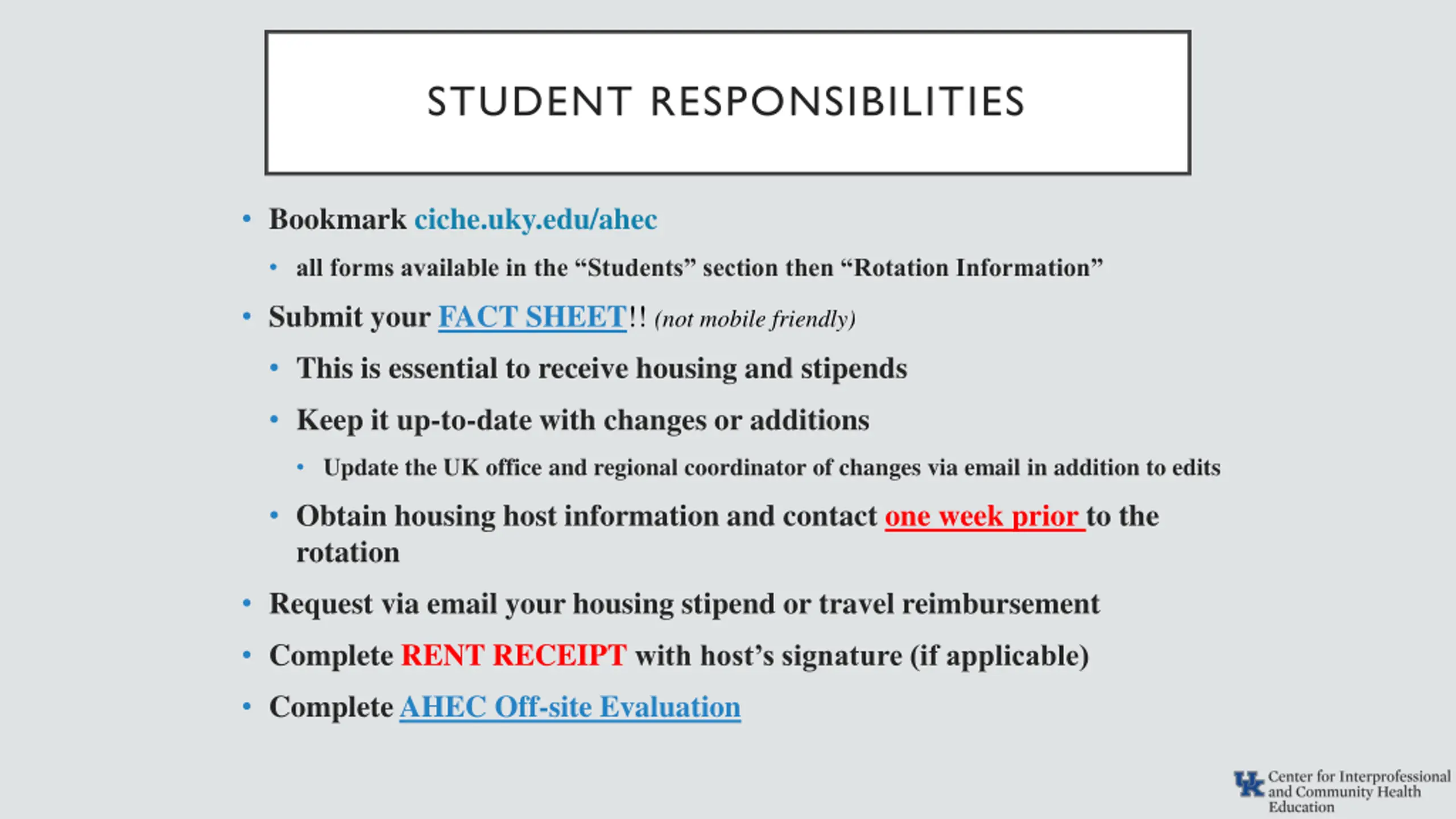 STUDENT RESPONSIBILITIES Bookmark ciche.uky.edu/ahec all forms available in the Students section then Rotation Information Submit your FACT SHEET!! (not mobile friendly) This is essential to receive housing and stipends Keep it up-to-date with changes or additions Update the UK office and regional coordinator of changes via email in addition to edits Obtain housing host information and contact one week prior to the rotation Request via email your housing stipend or travel reimbursement Complete RENT RECEIPT with host s signature (if applicable) Complete AHEC Off-site Evaluation