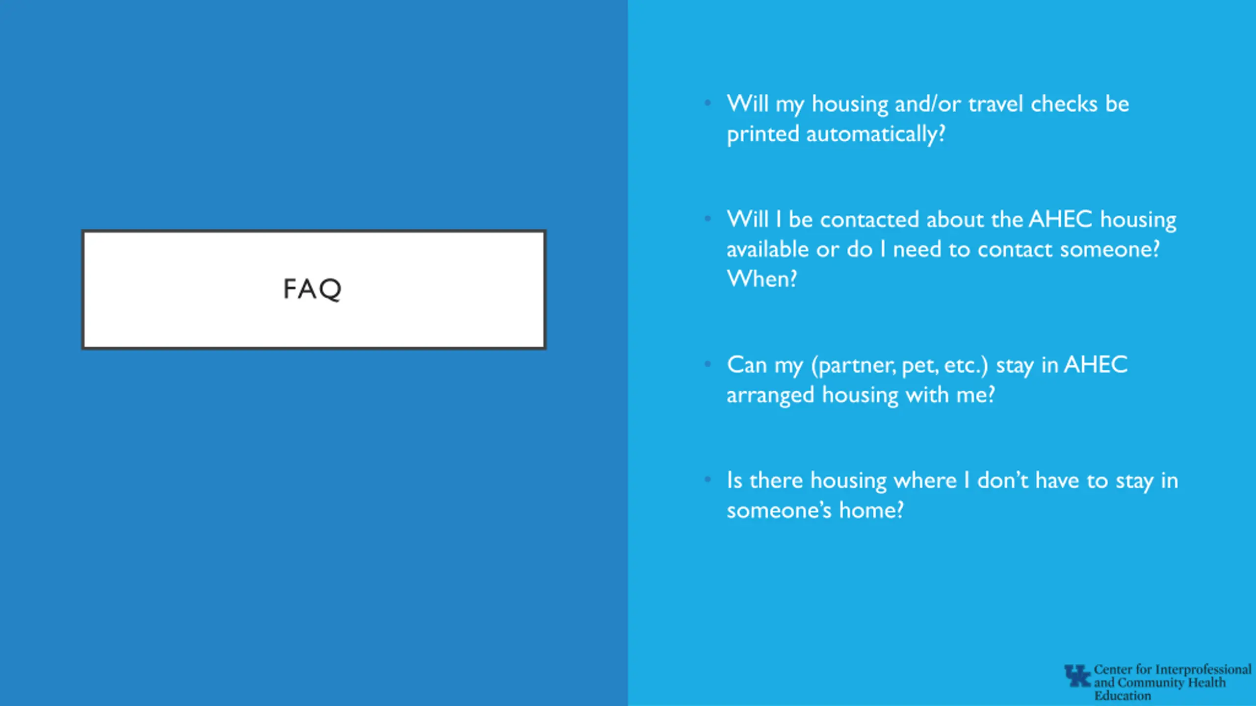 Will my housing and/or travel checks be printed automatically? Will I be contacted about the AHEC housing available or do I need to contact someone? When? FAQ Can my (partner, pet, etc.) stay in AHEC arranged housing with me? Is there housing where I don t have to stay in someone s home?