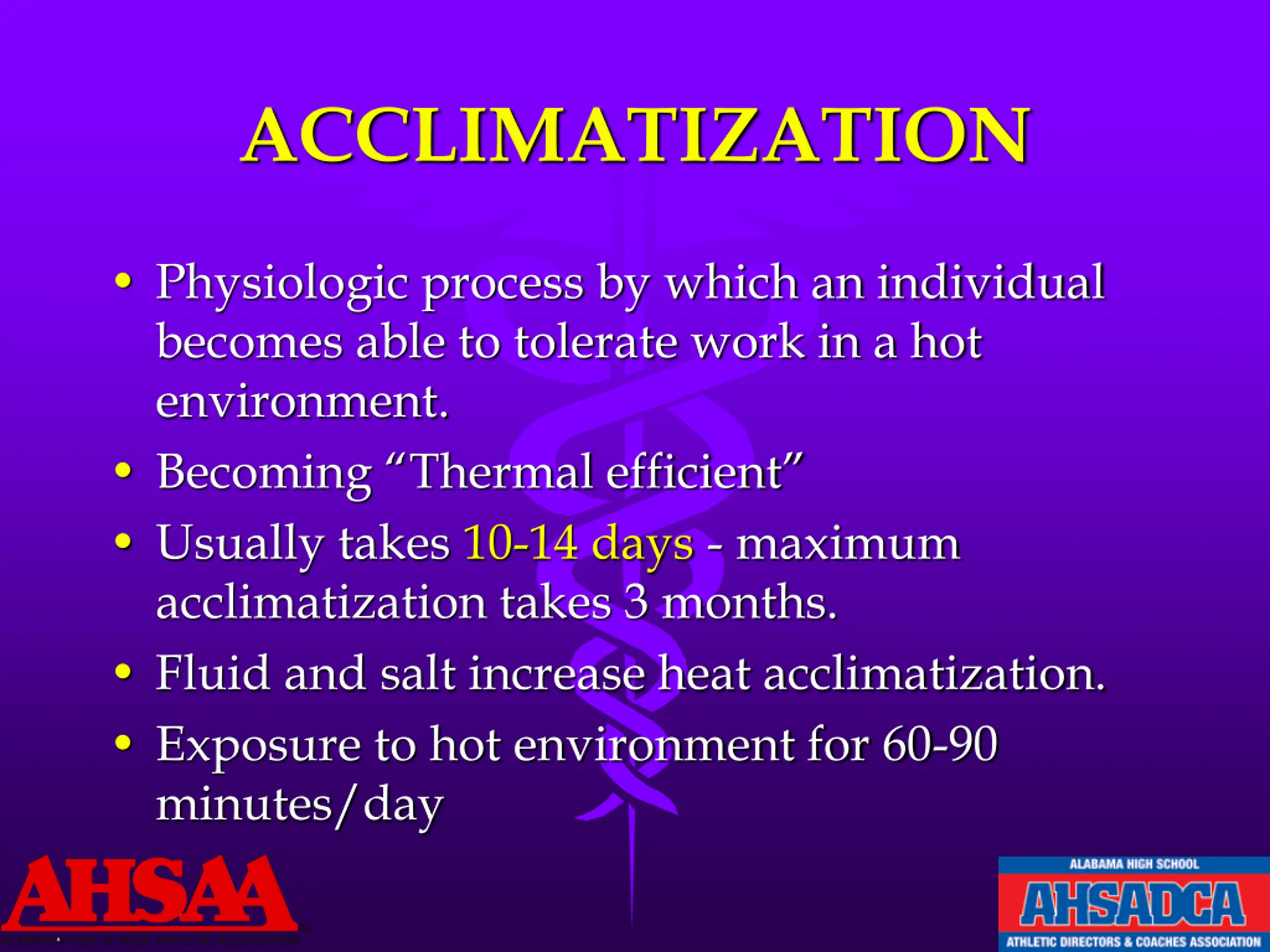 ACCLIMATIZATION Physiologic process by which an individual becomes able to tolerate work in a hot environment. Becoming Thermal efficient Usually takes 10-14 days - maximum acclimatization takes 3 months. Fluid and salt increase heat acclimatization. Exposure to hot environment for 60-90 minutes/day