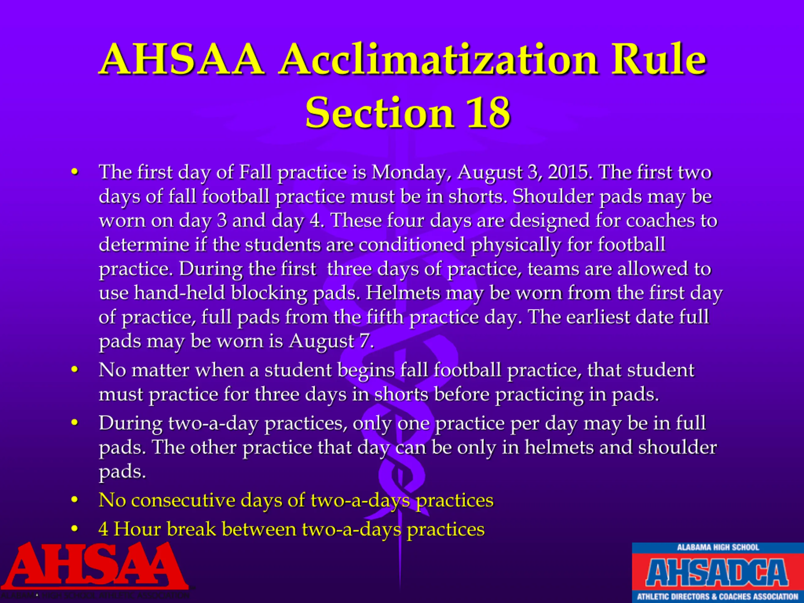 AHSAA Acclimatization Rule Section 18 The first day of Fall practice is Monday, August 3, 2015. The first two days of fall football practice must be in shorts. Shoulder pads may be worn on day 3 and day 4. These four days are designed for coaches to determine if the students are conditioned physically for football practice. During the first three days of practice, teams are allowed to use hand-held blocking pads. Helmets may be worn from the first day of practice, full pads from the fifth practice day. The earliest date full pads may be worn is August 7. No matter when a student begins fall football practice, that student must practice for three days in shorts before practicing in pads. During two-a-day practices, only one practice per day may be in full pads. The other practice that day can be only in helmets and shoulder pads. No consecutive days of two-a-days practices 4 Hour break between two-a-days practices