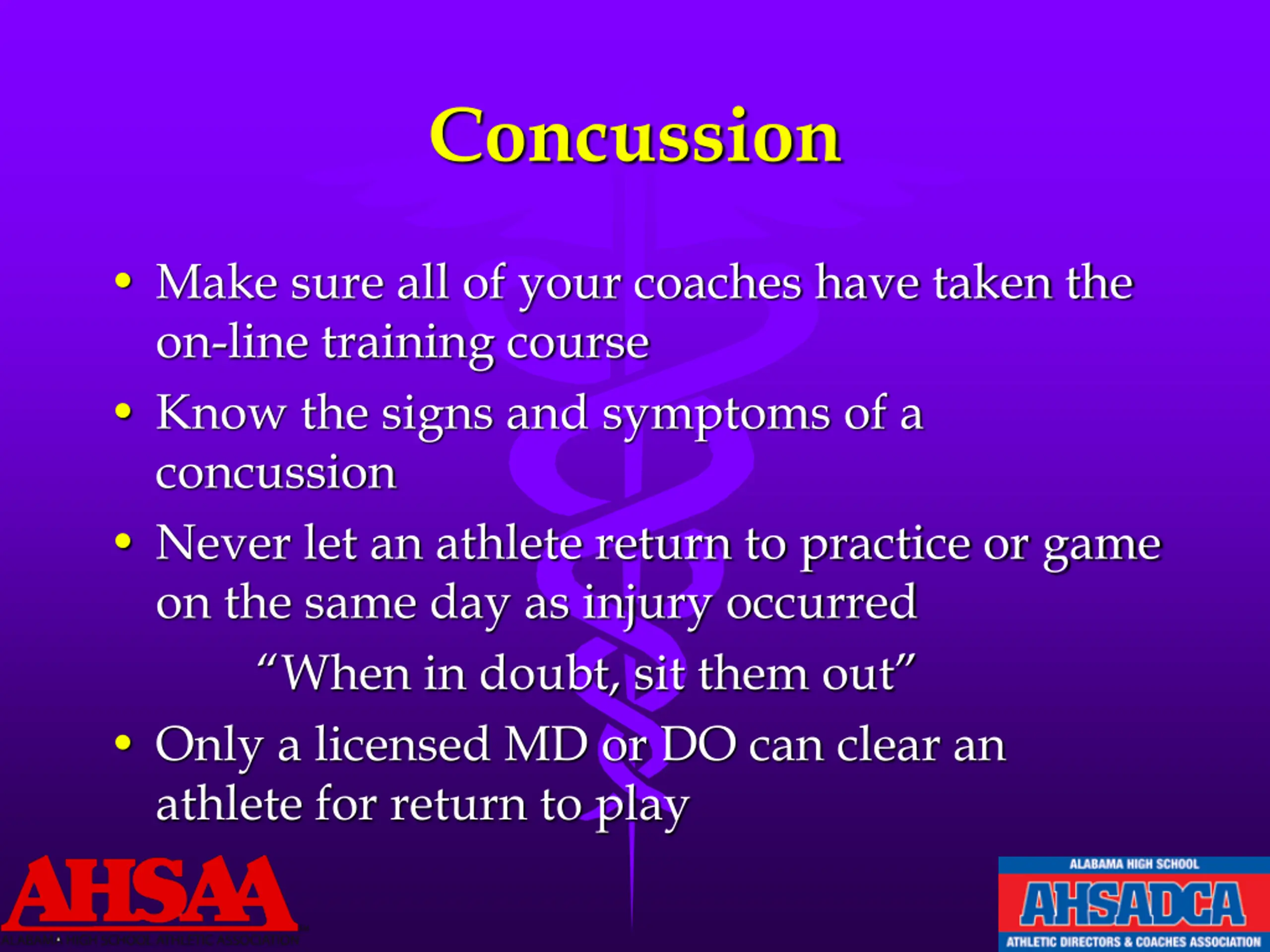 AHSAA Concussion Resources Mandatory Training for ALL coaches Links to NFHS on-line learning via web-site Instructional presentations on web-site