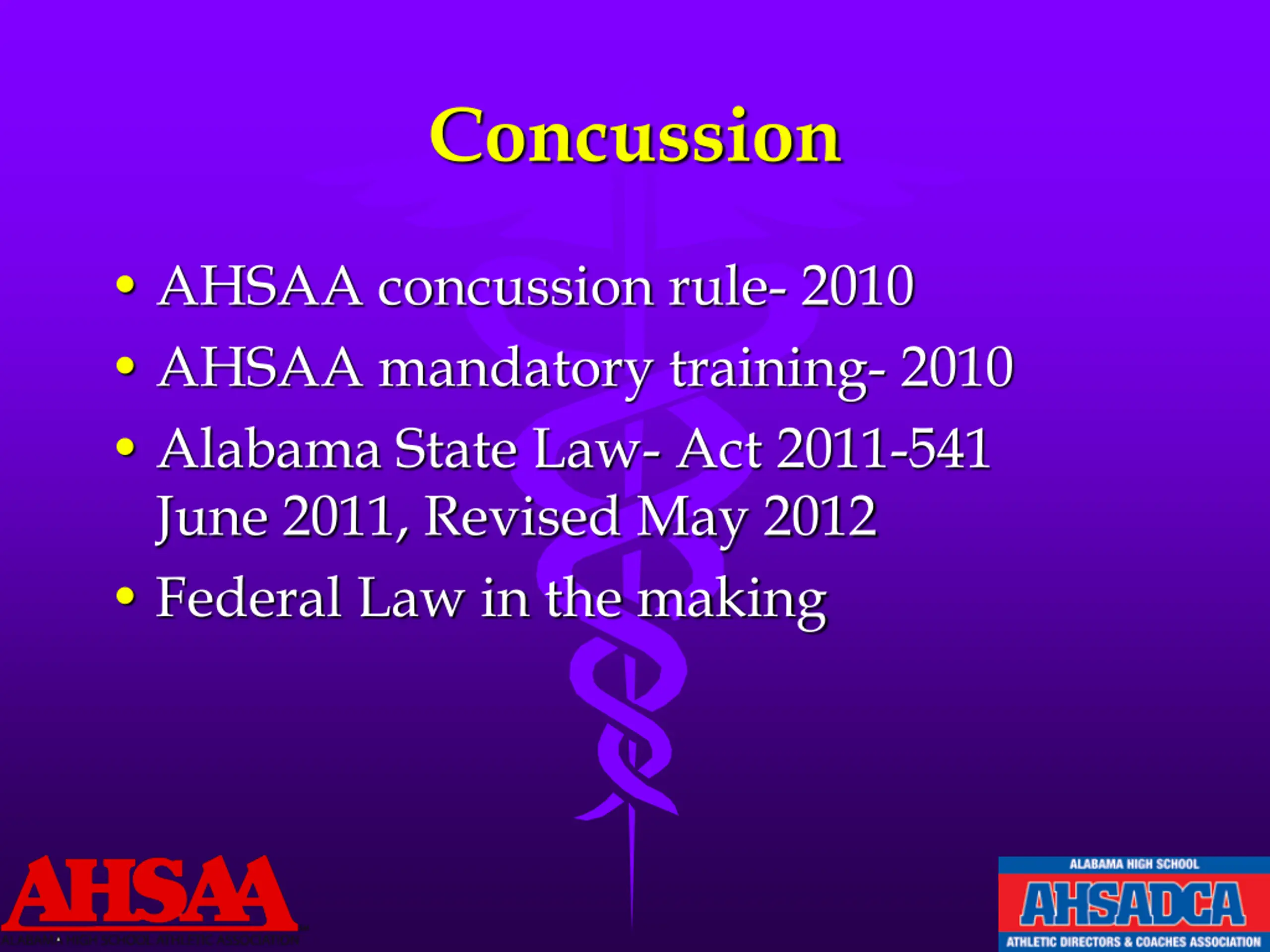 Concussion AHSAA concussion rule- 2010 AHSAA mandatory training- 2010 Alabama State Law- Act 2011-541 June 2011, Revised May 2012 Federal Law in the making
