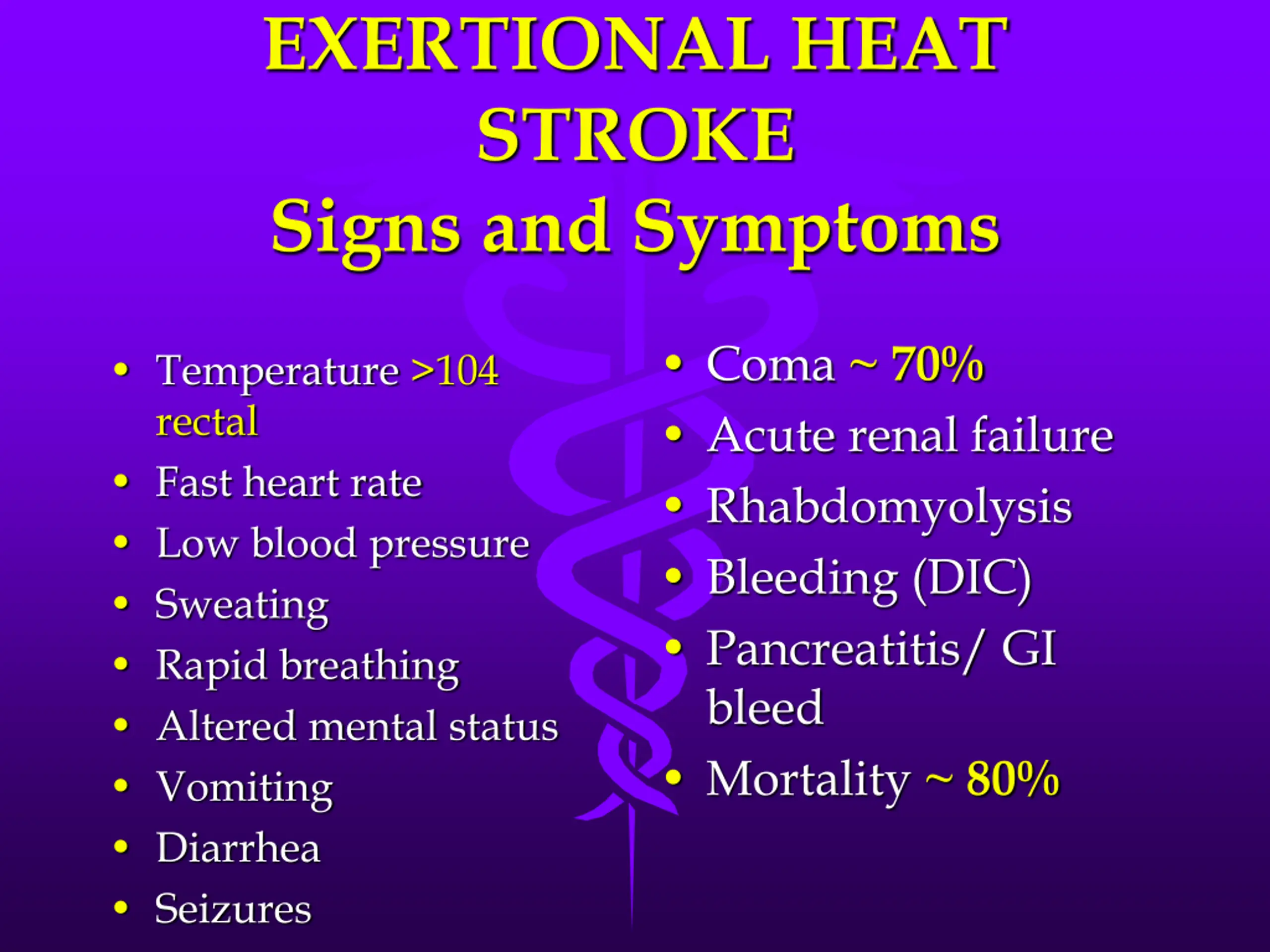EXERTIONAL HEAT STROKE Signs and Symptoms Coma ~ 70% Acute renal failure Rhabdomyolysis Bleeding (DIC) Pancreatitis/ GI bleed Mortality ~ 80% Temperature >104 rectal Fast heart rate Low blood pressure Sweating Rapid breathing Altered mental status Vomiting Diarrhea Seizures