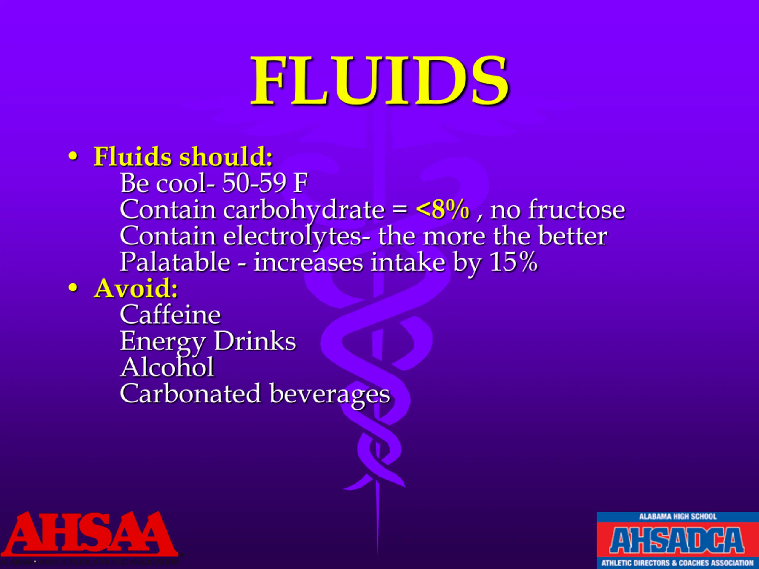 FLUIDS Fluids should: Be cool- 50-59 F Contain carbohydrate = <8% , no fructose Contain electrolytes- the more the better Palatable - increases intake by 15% Avoid: Caffeine Energy Drinks Alcohol Carbonated beverages