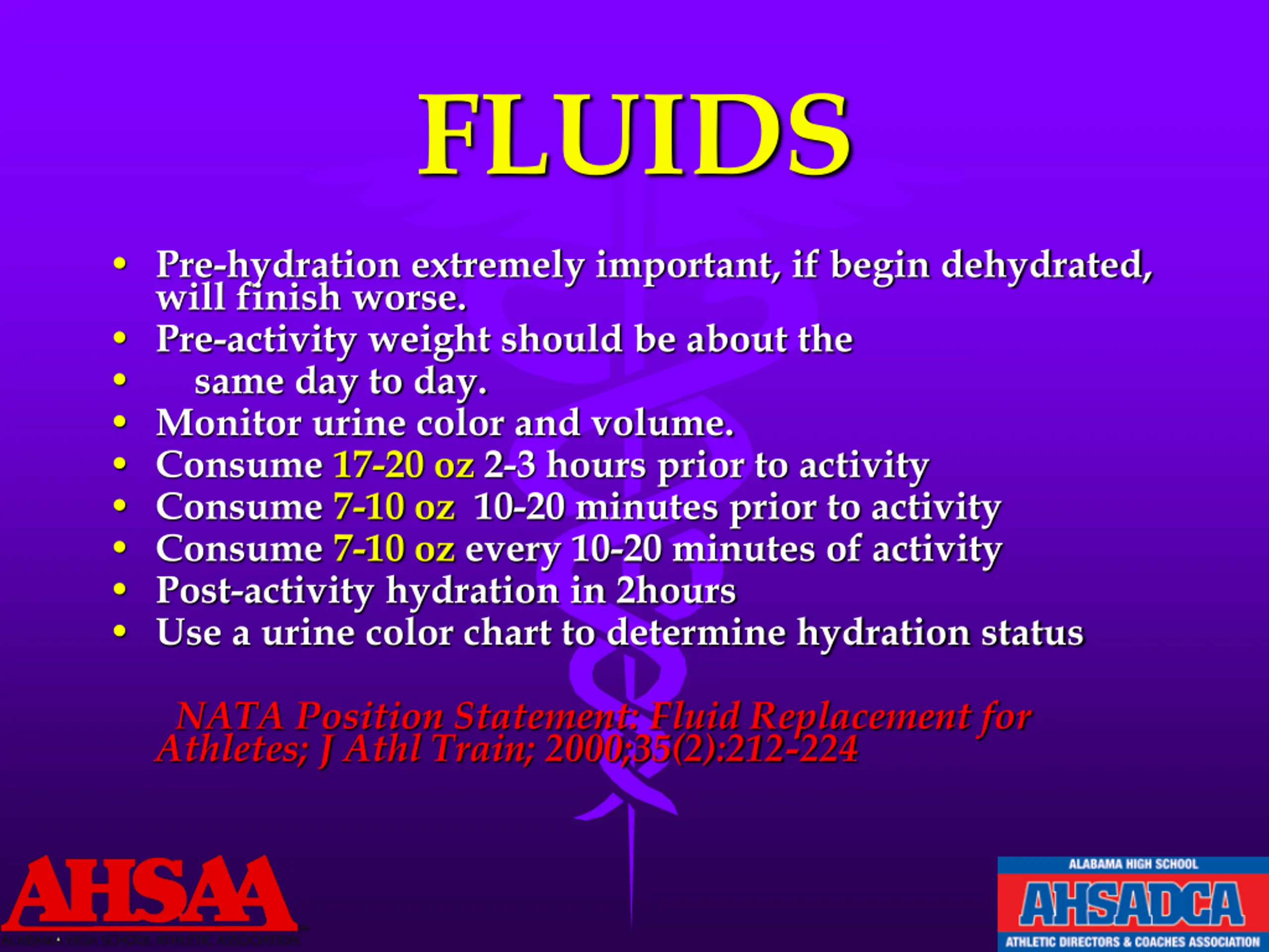 FLUIDS Pre-hydration extremely important, if begin dehydrated, will finish worse. Pre-activity weight should be about the same day to day. Monitor urine color and volume. Consume 17-20 oz 2-3 hours prior to activity Consume 7-10 oz 10-20 minutes prior to activity Consume 7-10 oz every 10-20 minutes of activity Post-activity hydration in 2hours Use a urine color chart to determine hydration status NATA Position Statement: Fluid Replacement for Athletes; J Athl Train; 2000;35(2):212-224