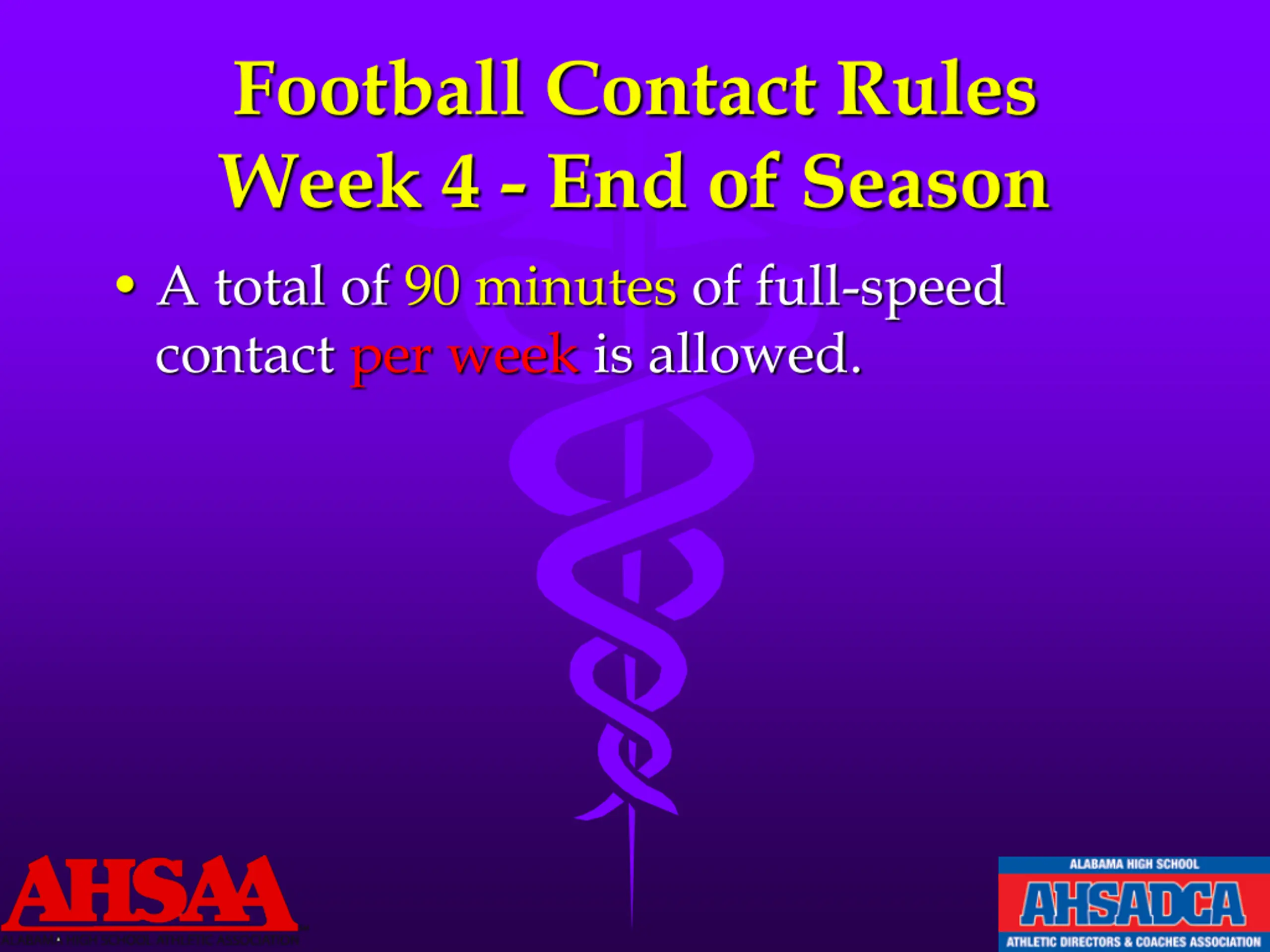 Football Contact Rules Week 4 - End of Season A total of 90 minutes of full-speed contact per week is allowed.