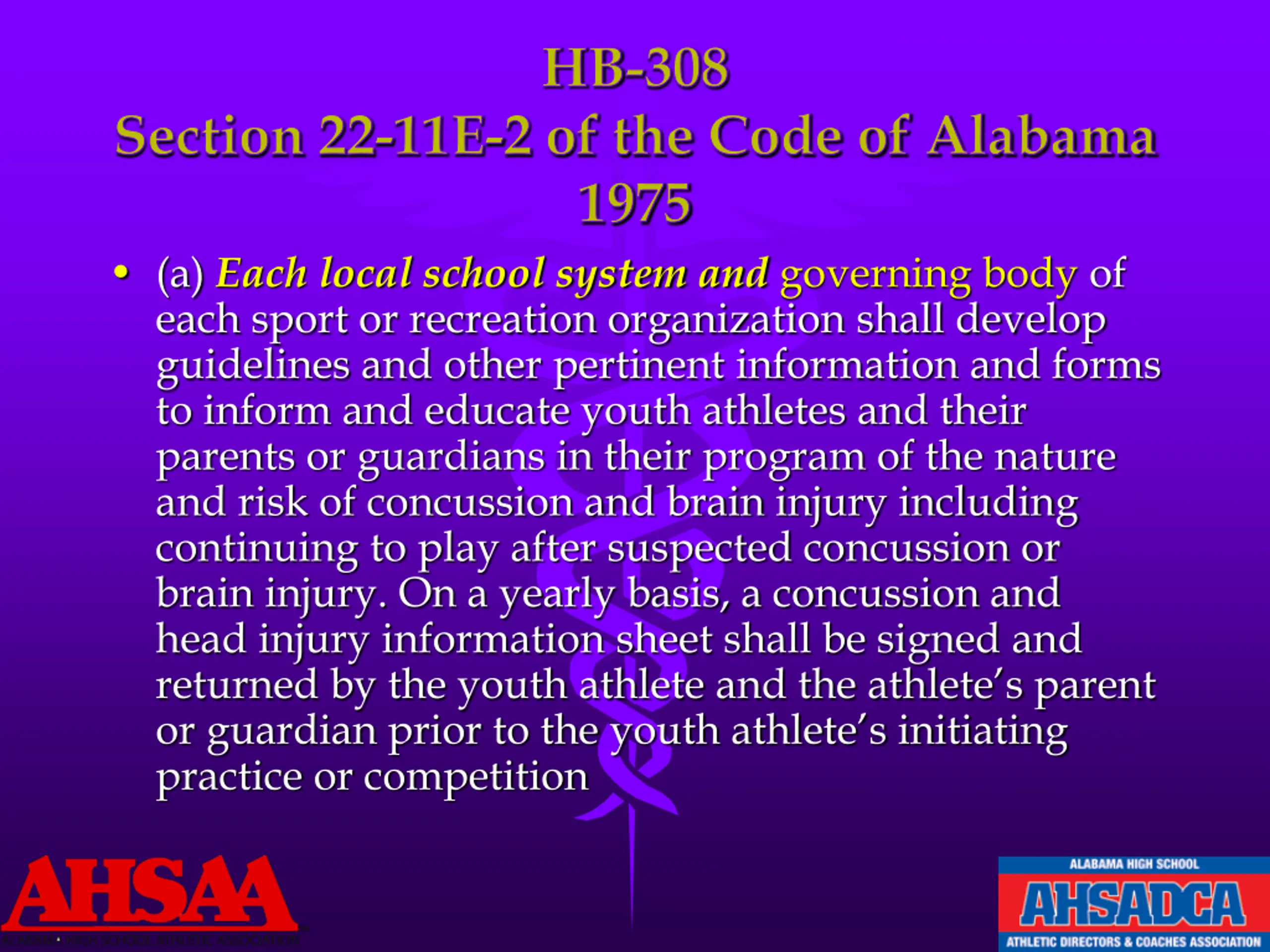 HB-308 Section 22-11E-2 of the Code of Alabama 1975 (a) Each local school system and governing body of each sport or recreation organization shall develop guidelines and other pertinent information and forms to inform and educate youth athletes and their parents or guardians in their program of the nature and risk of concussion and brain injury including continuing to play after suspected concussion or brain injury. On a yearly basis, a concussion and head injury information sheet shall be signed and returned by the youth athlete and the athlete s parent or guardian prior to the youth athlete s initiating practice or competition