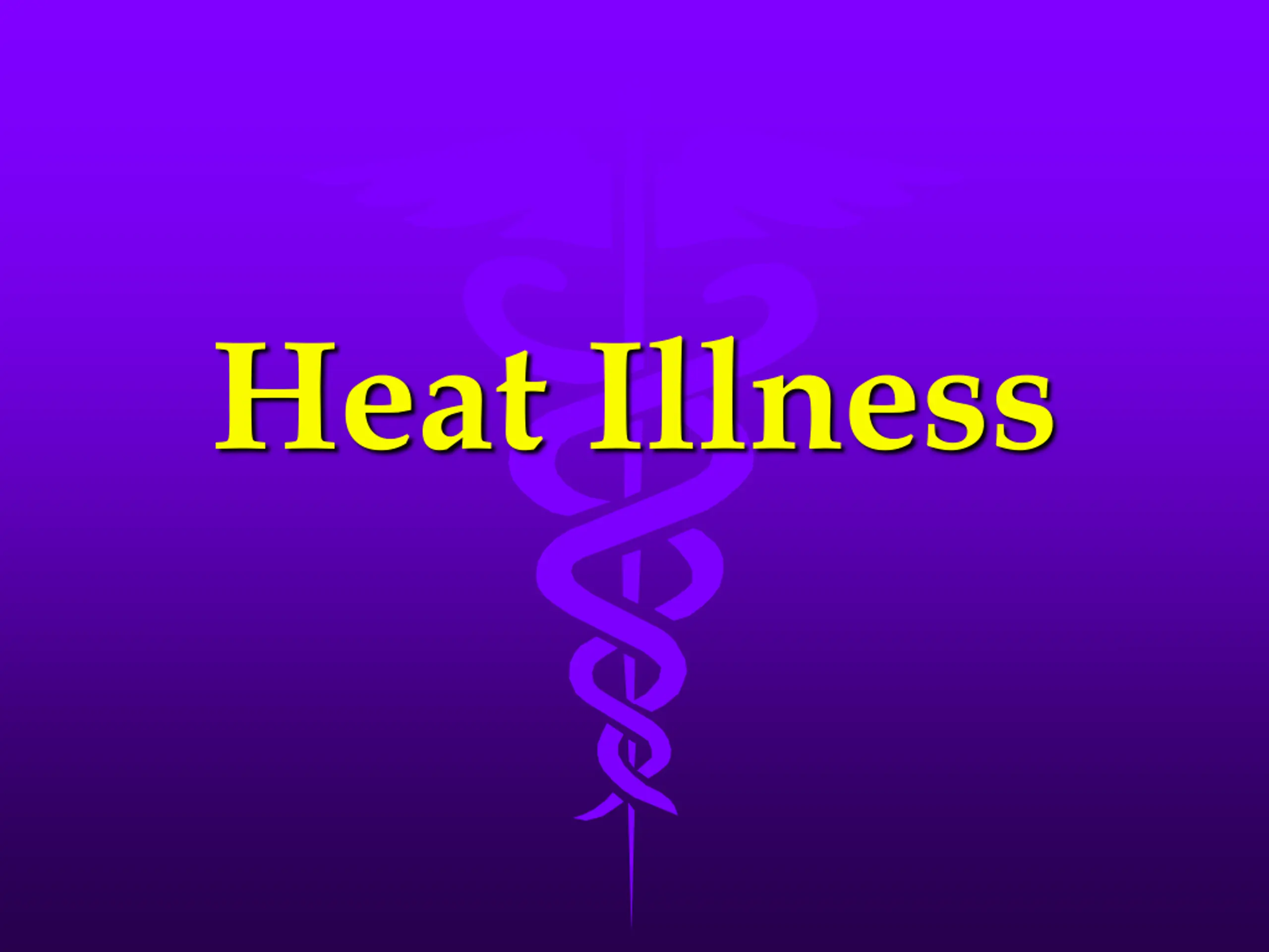 EXERTIONAL HEAT STROKE Treatment Measure rectal temperature Lower temperature as rapidly as possible!! Place in a tub of ice water, remove when temp <102 F (0 fatalities if cooled within 10 minutes) If no ice tubs, place iced towels over entire body and replace every 2-3 minutes 911- to Emergency Room only after cooled!