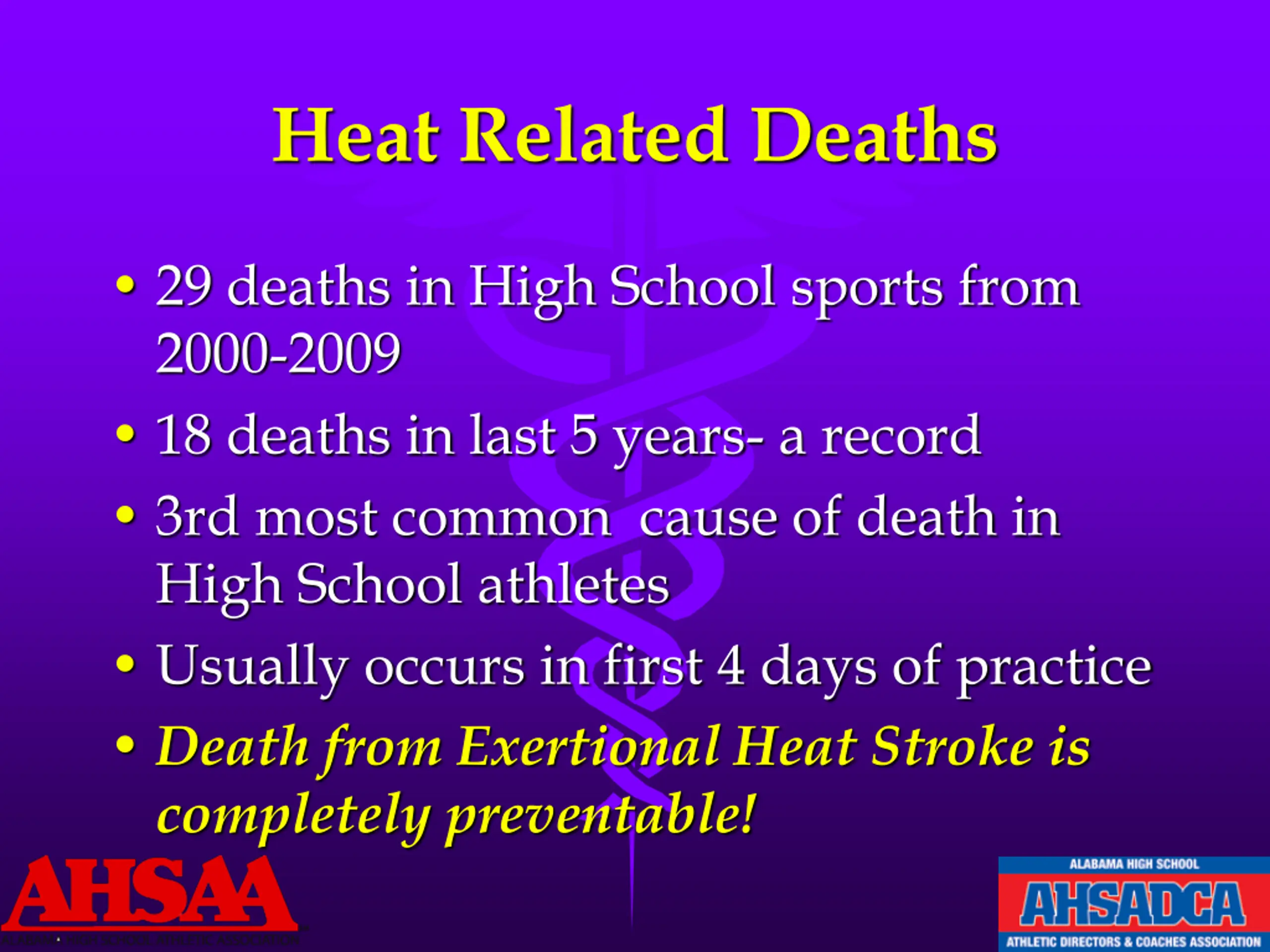 Heat Related Deaths 29 deaths in High School sports from 2000-2009 18 deaths in last 5 years- a record 3rd most common cause of death in High School athletes Usually occurs in first 4 days of practice Death from Exertional Heat Stroke is completely preventable!