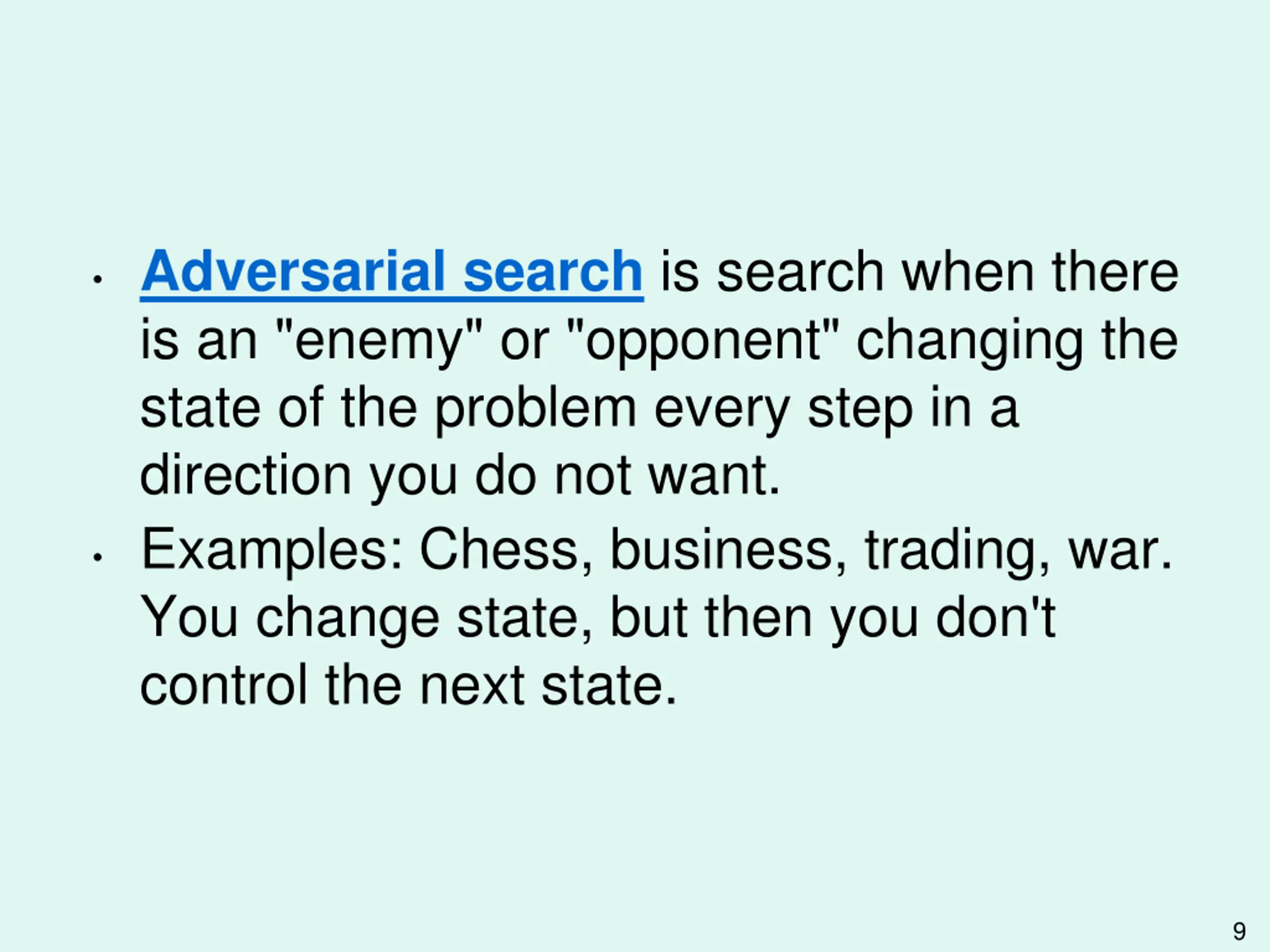Adversarial search is search when there is an "enemy" or "opponent" changing the state of the problem every step in a direction you do not want. Examples: Chess, business, trading, war. You change state, but then you don't control the next state. 9
