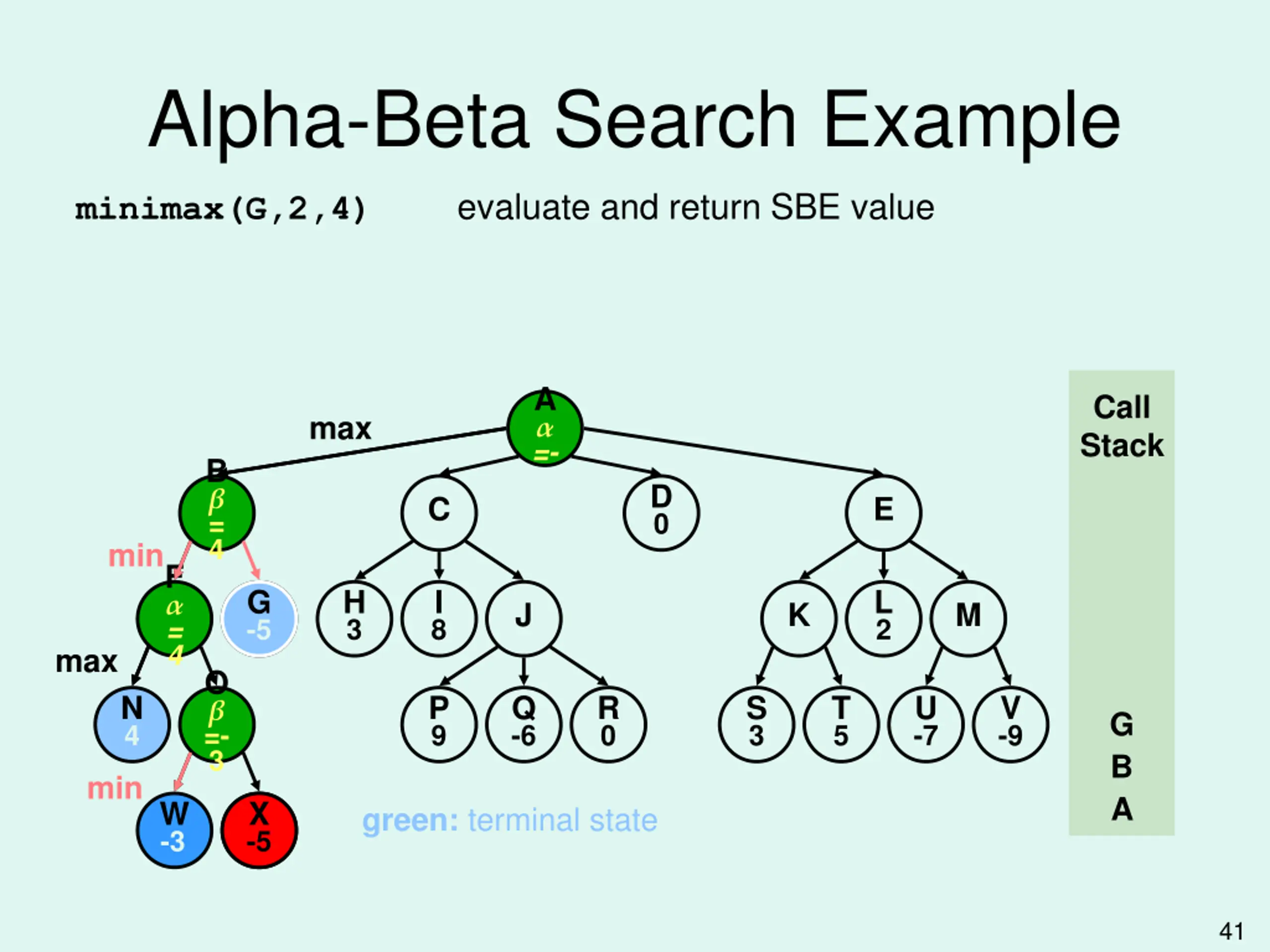 Alpha-Beta Search Example evaluate and return SBE value minimax(H,2,4) A =- A = 5 Call Stack max B =- 5 C = + D 0 E min F = 4 G -5 H H 3 3 I 8 L 2 J K M max O =- 3 N 4 P 9 Q -6 R 0 S 3 T 5 U -7 V -9 H C min A W -3 X -5 -5 X green: terminal state 45