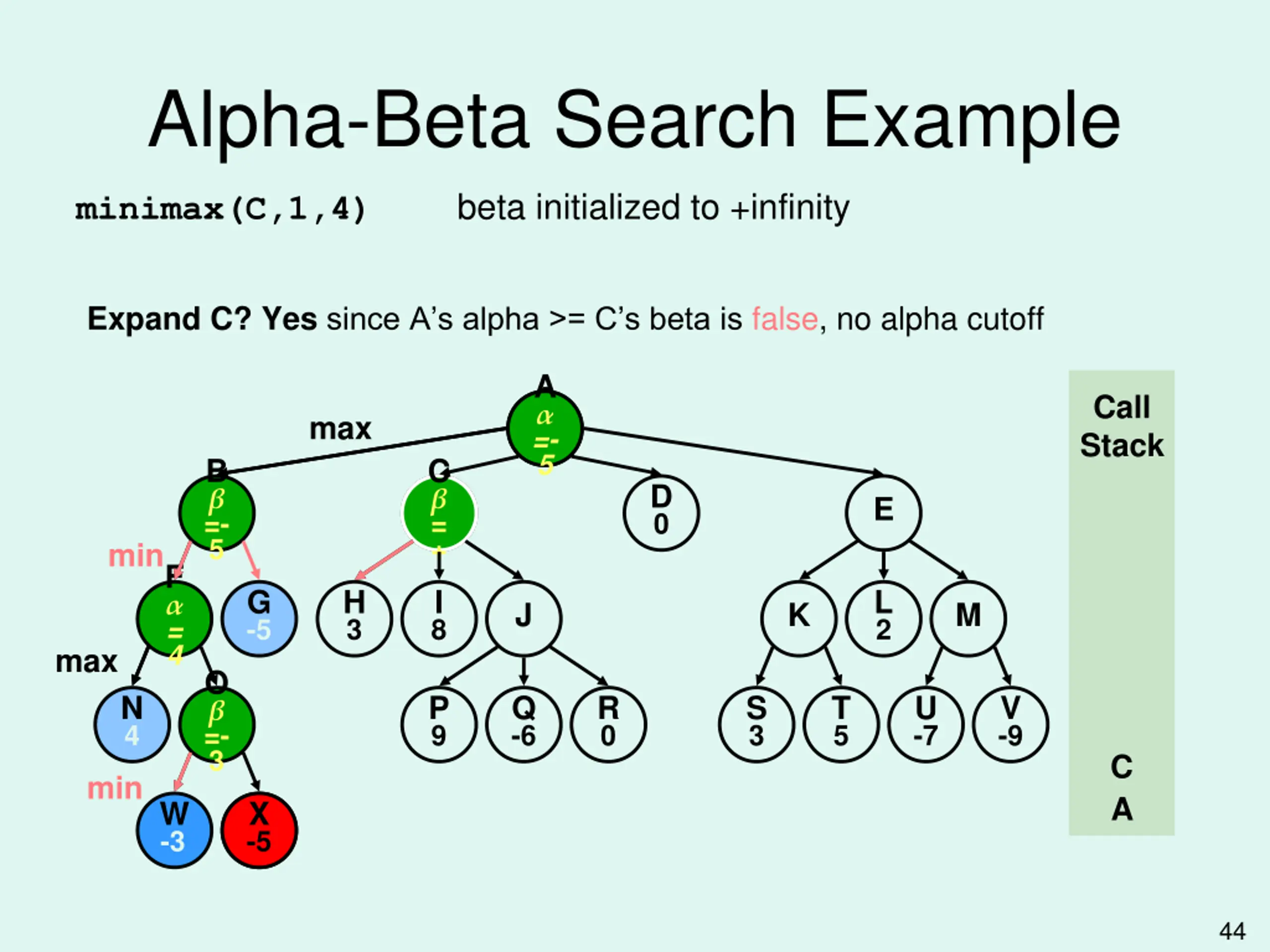 Alpha-Beta Search Example alpha = -5, since -5 >= -infinity (maximizing) back to minimax(A,0,4) Keep expanding A? Yes since there are more successors, no cutoff test A =- A = 5 Call Stack max B =- 5 D 0 C E min F = 4 G -5 H 3 I 8 L 2 J K M max O =- 3 N 4 P 9 Q -6 R 0 S 3 T 5 U -7 V -9 min A W -3 X -5 -5 X 43