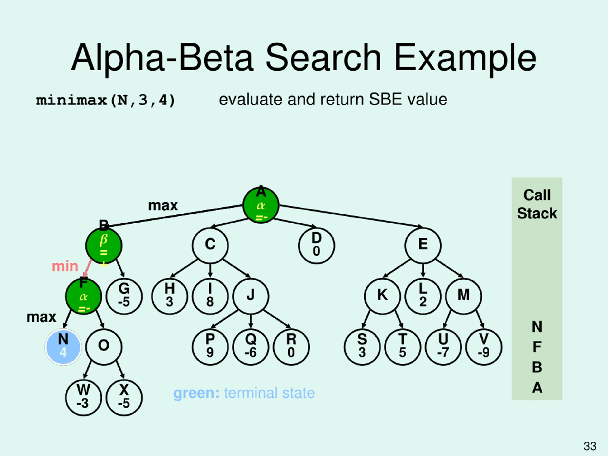 Alpha-Beta Search Example evaluate and return SBE value minimax(N,3,4) A =- Call Stack max B = + D 0 C E min F =- G -5 H 3 I 8 L 2 J K M max N N 4 4 N P 9 Q -6 R 0 S 3 T 5 U -7 V -9 O F B A W -3 X -5 green: terminal state 33