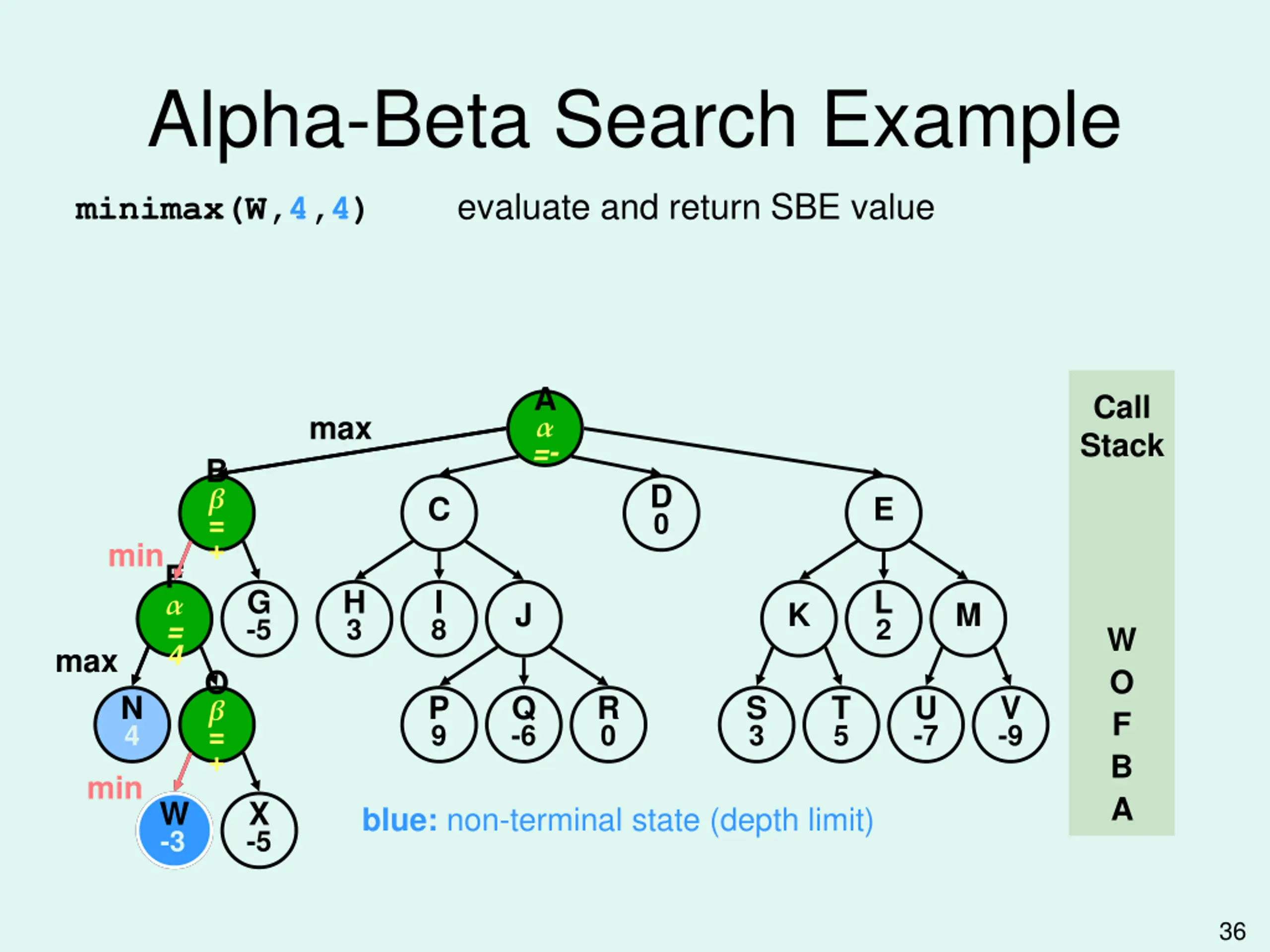 Alpha-Beta Search Example evaluate and return SBE value minimax(W,4,4) A =- Call Stack max B = + D 0 C E min F = 4 G -5 H 3 I 8 L 2 J K M W max O O = + N 4 P 9 Q -6 R 0 S 3 T 5 U -7 V -9 F B min A W -3 -3 W X -5 blue: non-terminal state (depth limit) 36