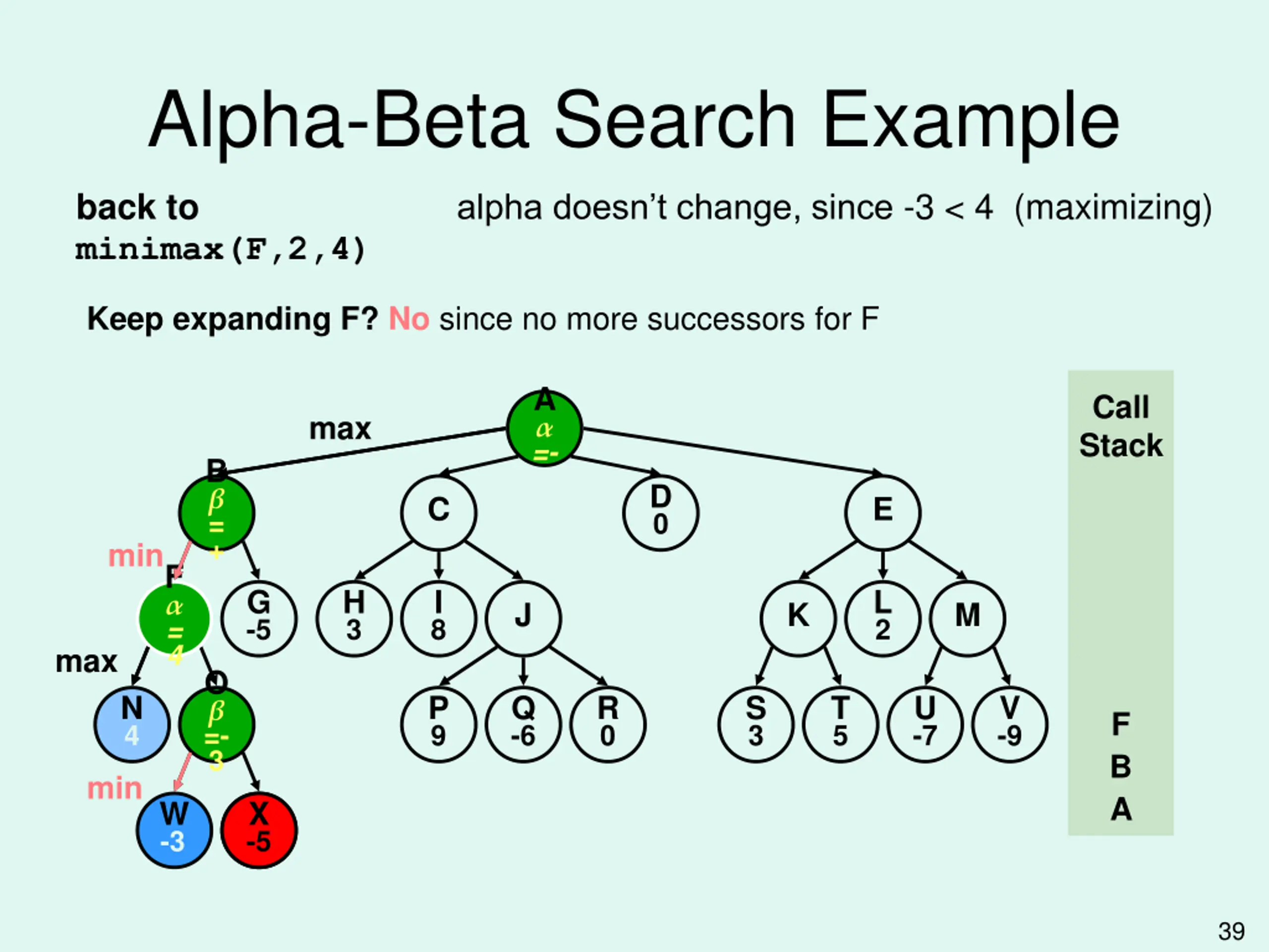 Alpha-Beta Search Example Why? Smart opponent will choose W or worse, thus O's upper bound is 3. Computer already has better move at N. A =- Call Stack max B = + D 0 C E min F = 4 G -5 H 3 I 8 L 2 J K M max O O =- 3 N 4 P 9 Q -6 R 0 S 3 T 5 U -7 V -9 F B min A W -3 X -5 -5 X red: pruned state 38