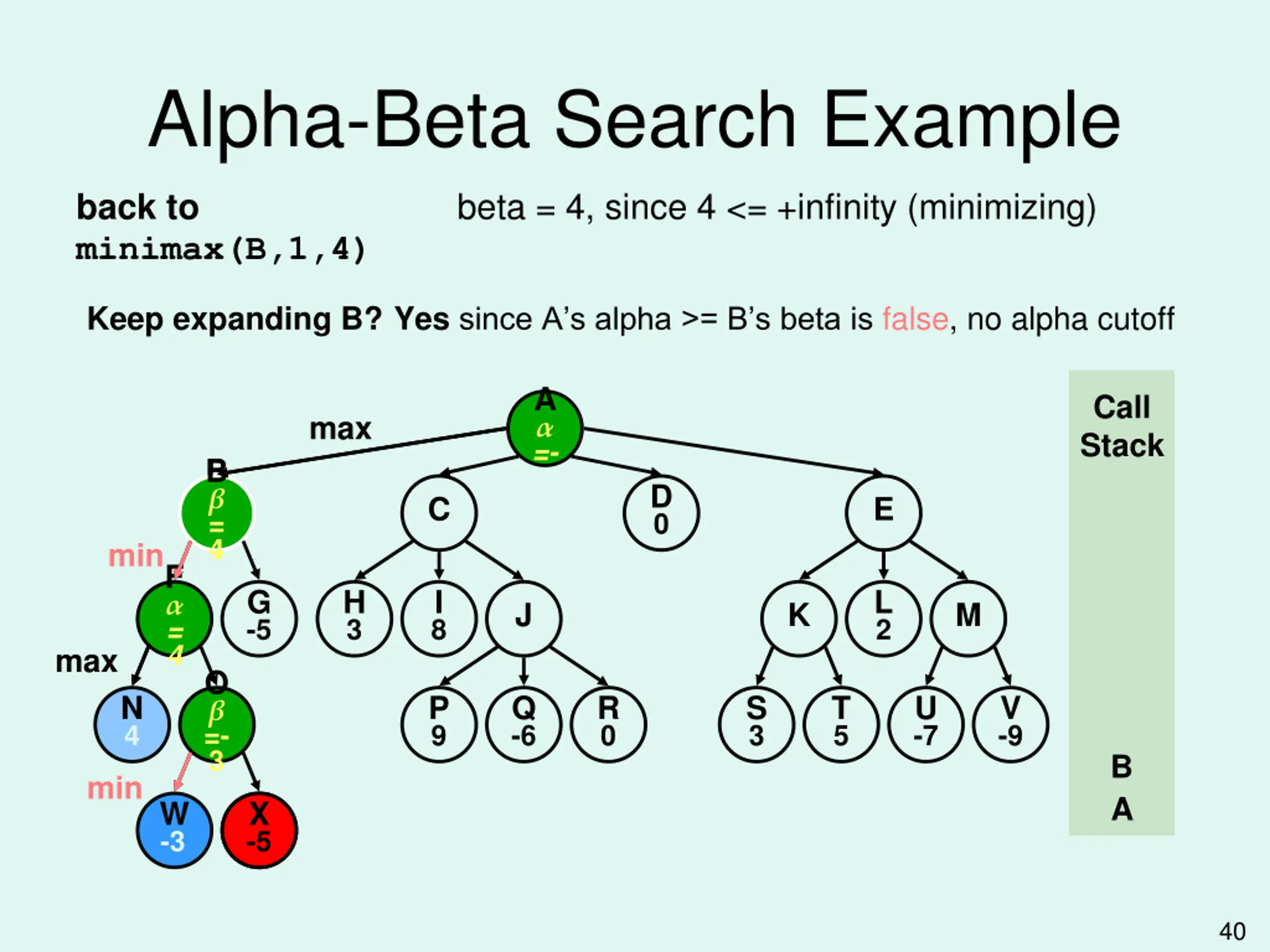 Alpha-Beta Search Example beta = 4, since 4 <= +infinity (minimizing) back to minimax(B,1,4) Keep expanding B? Yes since A s alpha >= B s beta is false, no alpha cutoff A =- Call Stack max B = B = + 4 D 0 C E min F = 4 G -5 H 3 I 8 L 2 J K M max O =- 3 N 4 P 9 Q -6 R 0 S 3 T 5 U -7 V -9 B min A W -3 X -5 -5 X 40