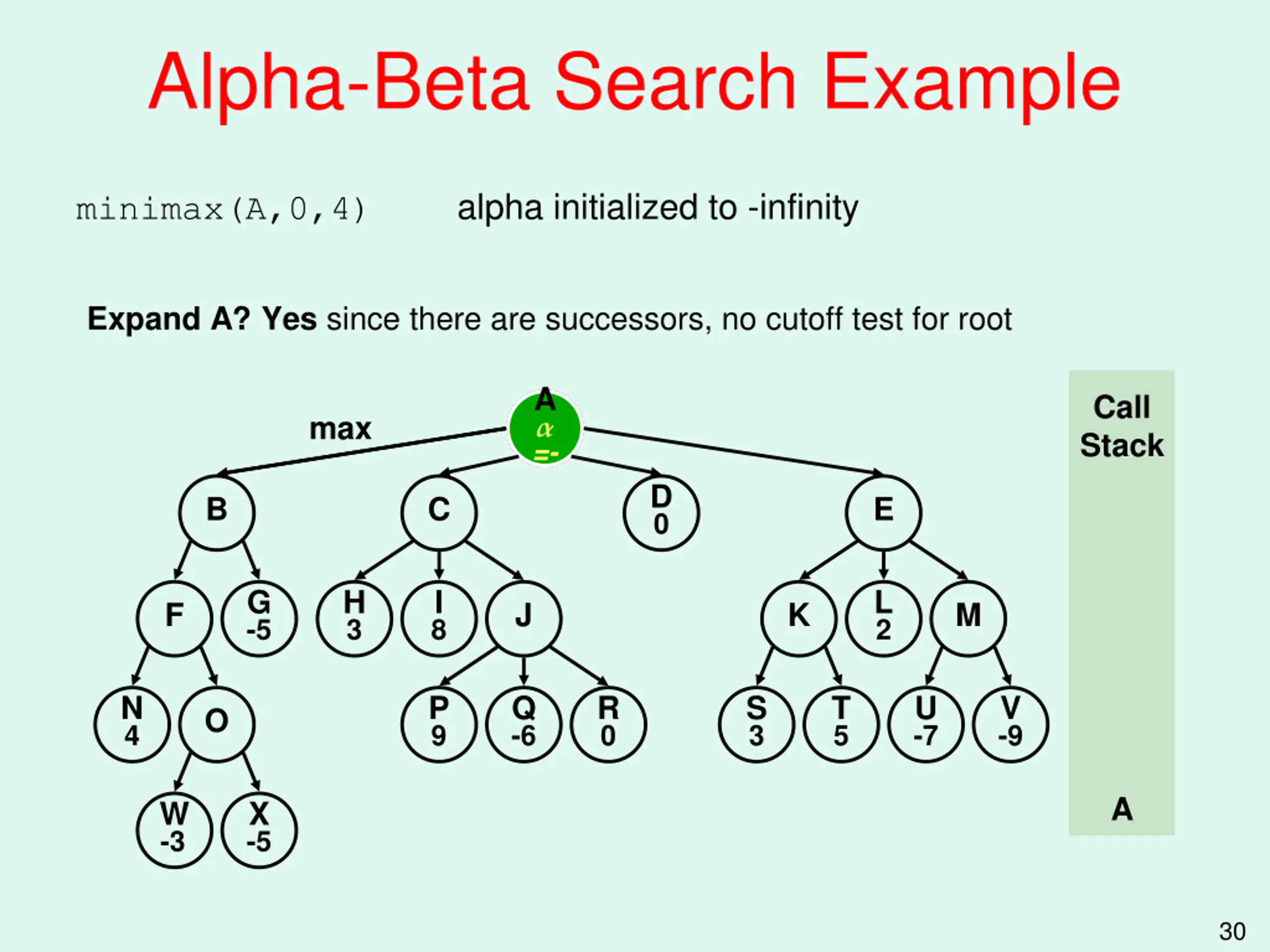 Alpha-Beta Search Example alpha initialized to -infinity minimax(A,0,4) Expand A? Yes since there are successors, no cutoff test for root A Call Stack A A =- max D 0 B C E G -5 H 3 I 8 L 2 F J K M N 4 P 9 Q -6 R 0 S 3 T 5 U -7 V -9 O A W -3 X -5 30
