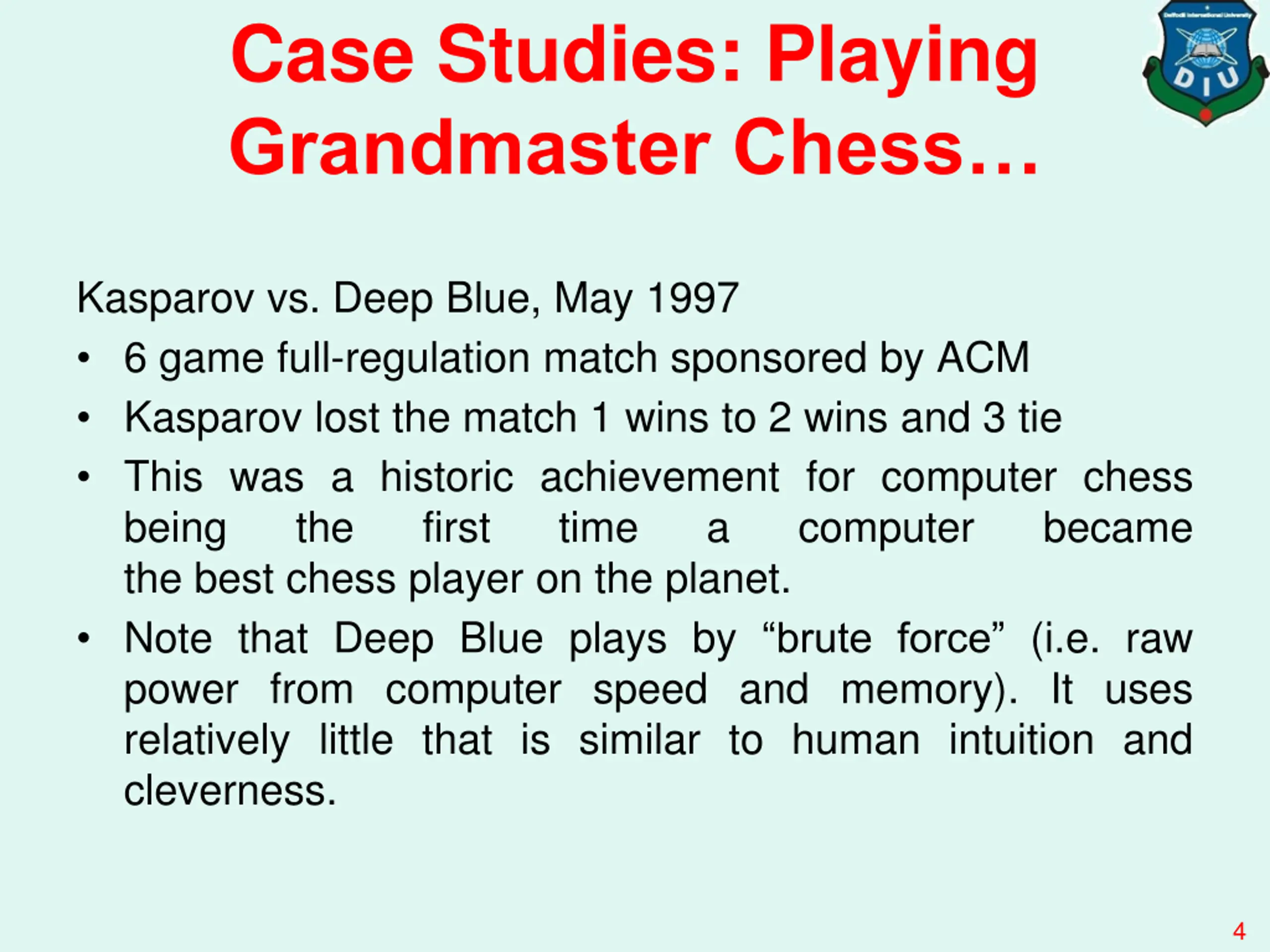 Case Studies: Playing Grandmaster Chess Kasparov vs. Deep Blue, May 1997 6 game full-regulation match sponsored by ACM Kasparov lost the match 1 wins to 2 wins and 3 tie This was a historic achievement for computer chess being the first time the best chess player on the planet. Note that Deep Blue plays by brute force (i.e. raw power from computer speed and memory). It uses relatively little that is similar to human intuition and cleverness. a computer became 4