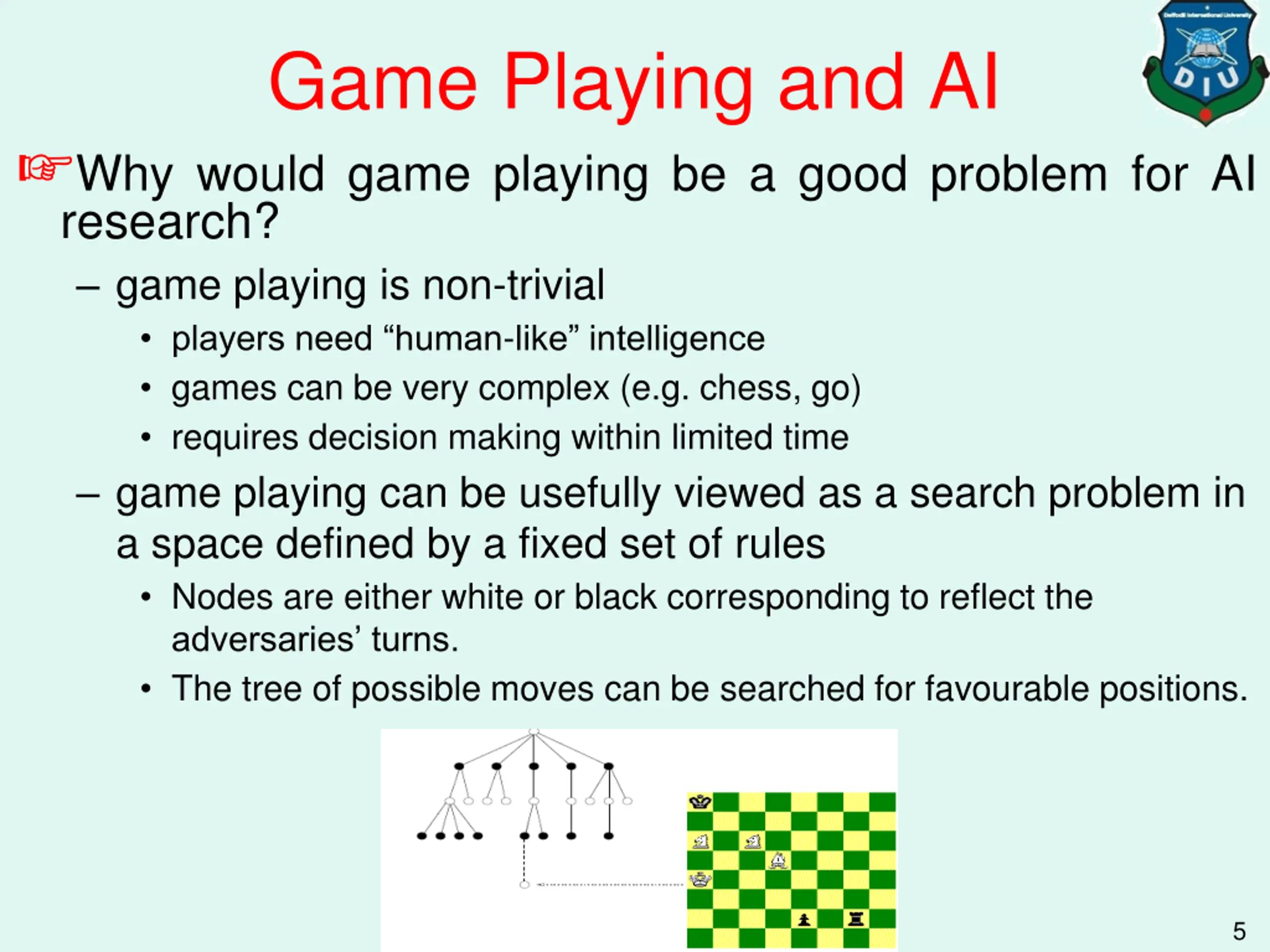 Game Playing and AI Why would game playing be a good problem for AI research? game playing is non-trivial players need human-like intelligence games can be very complex (e.g. chess, go) requires decision making within limited time game playing can be usefully viewed as a search problem in a space defined by a fixed set of rules Nodes are either white or black corresponding to reflect the adversaries turns. The tree of possible moves can be searched for favourable positions. 5