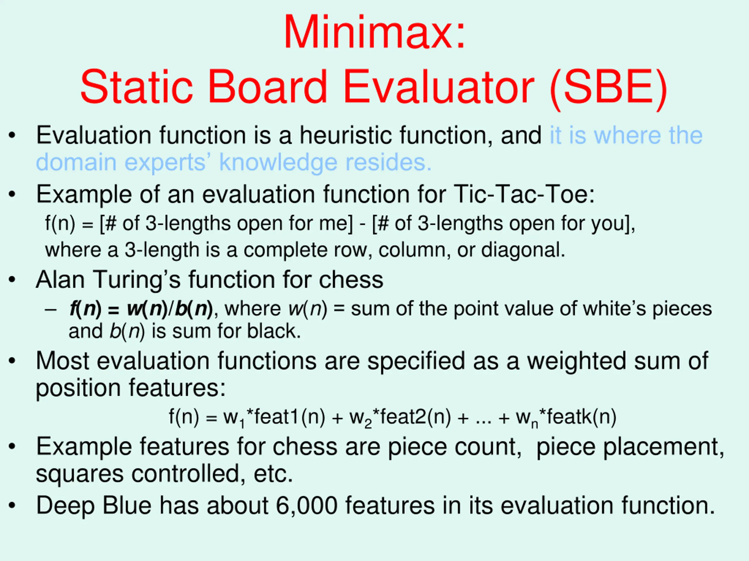 Minimax: Static Board Evaluator (SBE) Evaluation function is a heuristic function, and it is where the domain experts knowledge resides. Example of an evaluation function for Tic-Tac-Toe: f(n) = [# of 3-lengths open for me] - [# of 3-lengths open for you], where a 3-length is a complete row, column, or diagonal. Alan Turing s function for chess f(n) = w(n)/b(n), where w(n) = sum of the point value of white s pieces and b(n) is sum for black. Most evaluation functions are specified as a weighted sum of position features: f(n) = w1*feat1(n) + w2*feat2(n) + ... + wn*featk(n) Example features for chess are piece count, piece placement, squares controlled, etc. Deep Blue has about 6,000 features in its evaluation function.