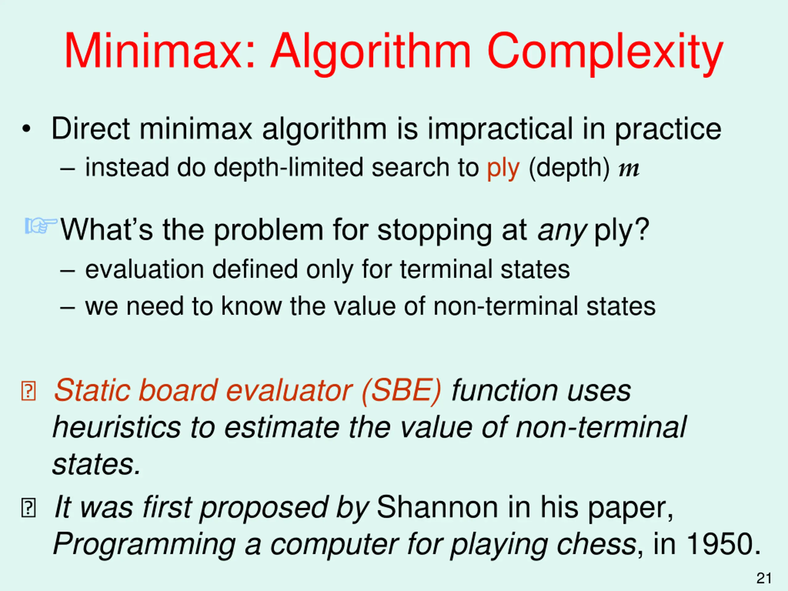 Minimax: Algorithm Complexity Direct minimax algorithm is impractical in practice instead do depth-limited search to ply (depth) m What s the problem for stopping at any ply? evaluation defined only for terminal states we need to know the value of non-terminal states ? Static board evaluator (SBE) function uses heuristics to estimate the value of non-terminal states. ? It was first proposed by Shannon in his paper, Programming a computer for playing chess, in 1950. 21