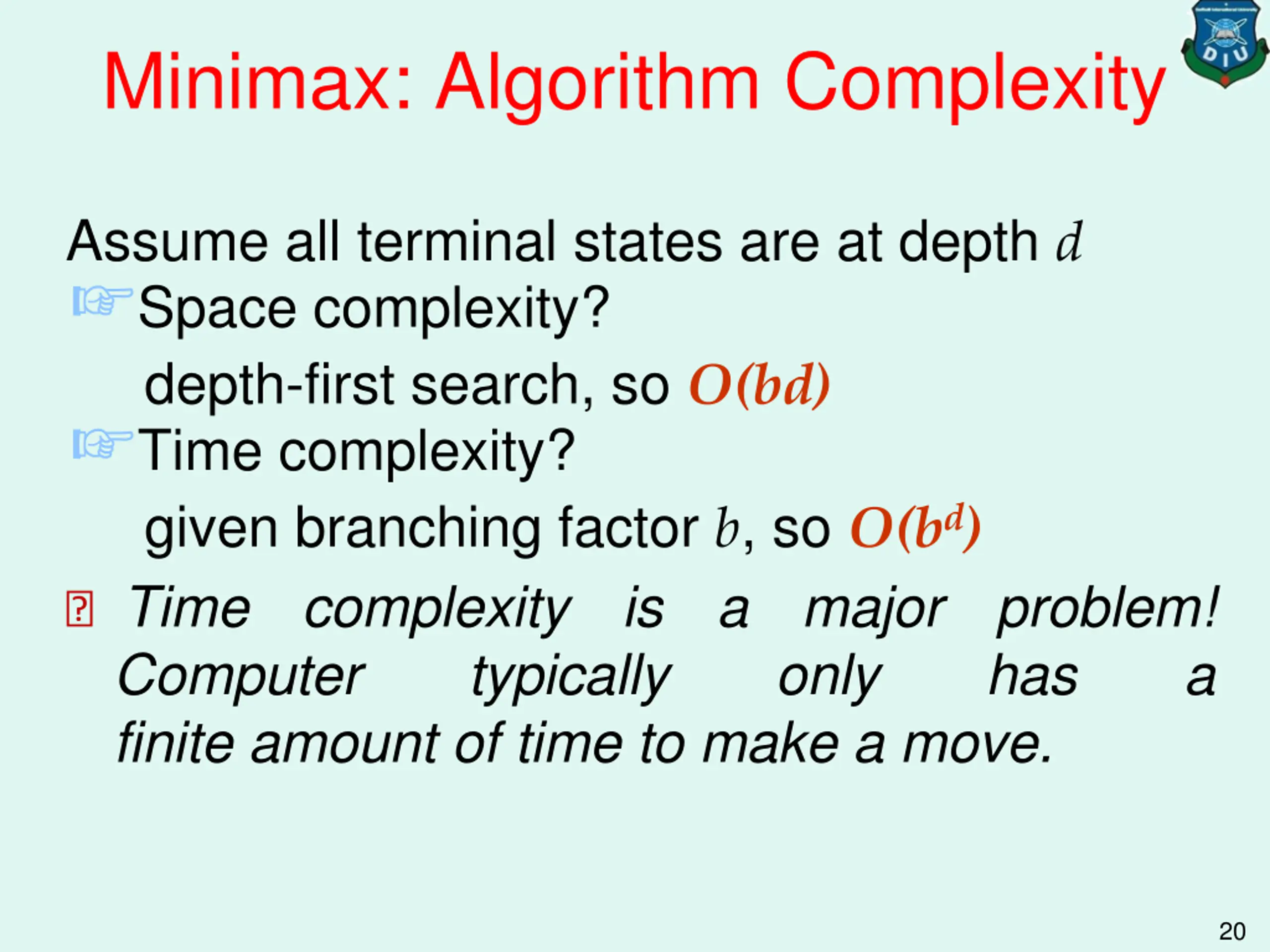 Minimax: Algorithm Complexity Assume all terminal states are at depth d Space complexity? depth-first search, so O(bd) Time complexity? given branching factor b, so O(bd) ? Time complexity Computer typically finite amount of time to make a move. is a major only problem! has a 20