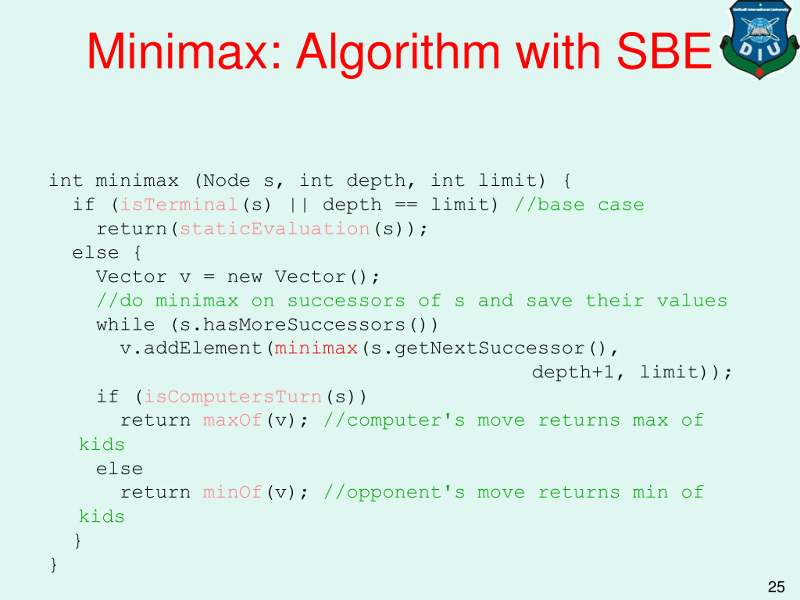 Minimax: Algorithm with SBE int minimax (Node s, int depth, int limit) { if (isTerminal(s) || depth == limit) //base case return(staticEvaluation(s)); else { Vector v = new Vector(); //do minimax on successors of s and save their values while (s.hasMoreSuccessors()) v.addElement(minimax(s.getNextSuccessor(), depth+1, limit)); if (isComputersTurn(s)) return maxOf(v); //computer's move returns max of kids else return minOf(v); //opponent's move returns min of kids } } 25
