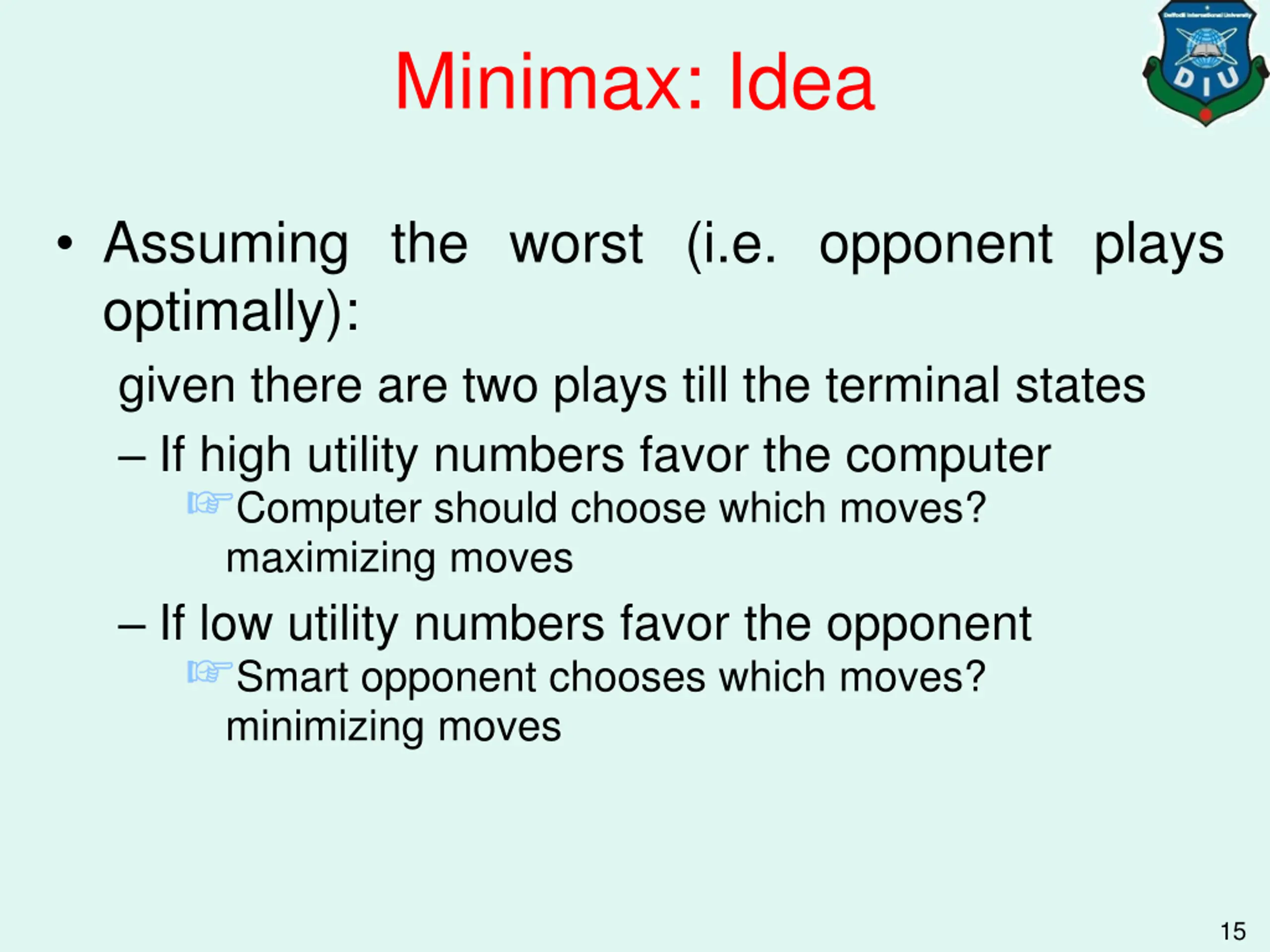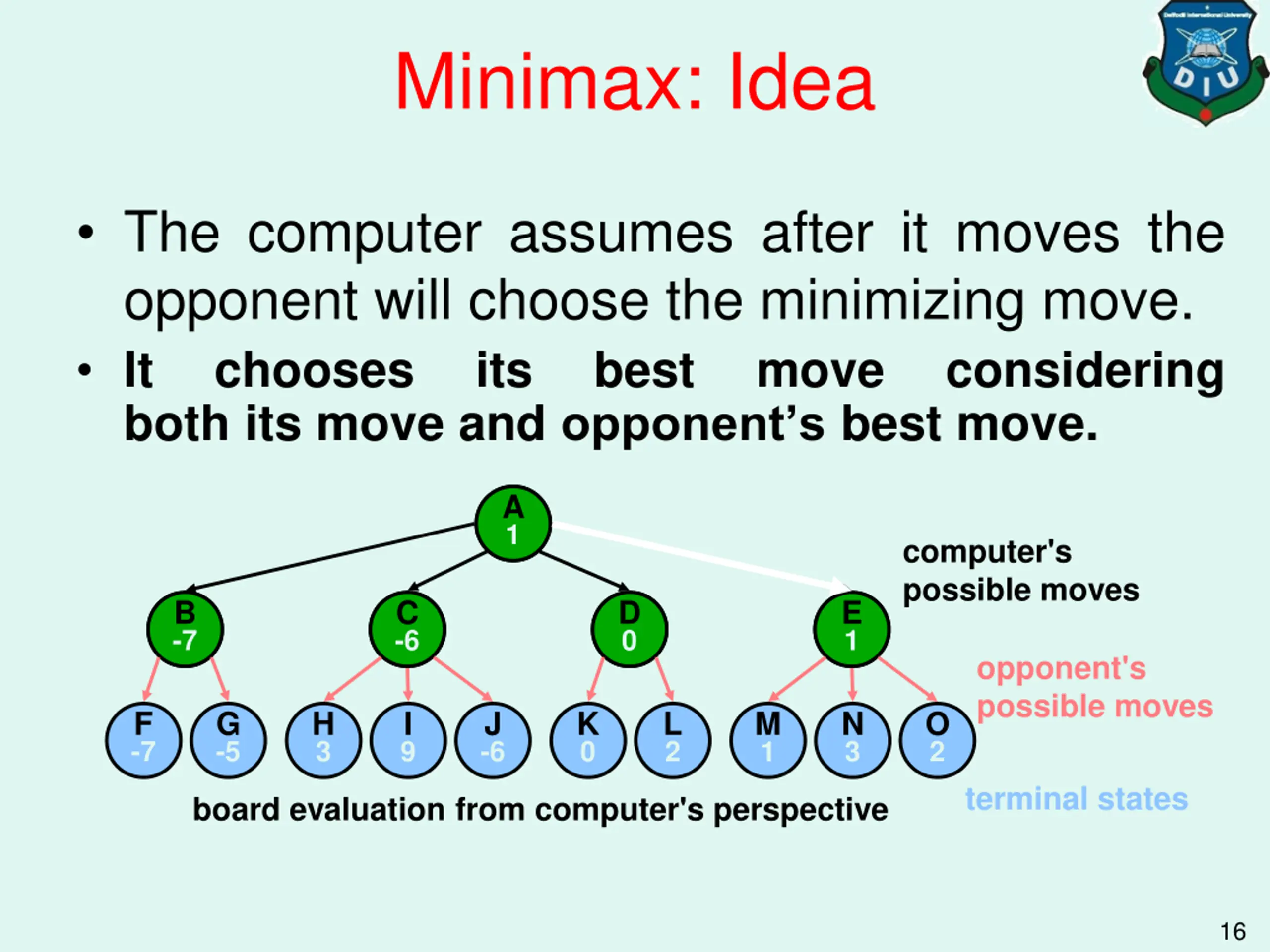 Minimax: Idea Assuming the worst (i.e. opponent plays optimally): given there are two plays till the terminal states If high utility numbers favor the computer Computer should choose which moves? maximizing moves If low utility numbers favor the opponent Smart opponent chooses which moves? minimizing moves 15