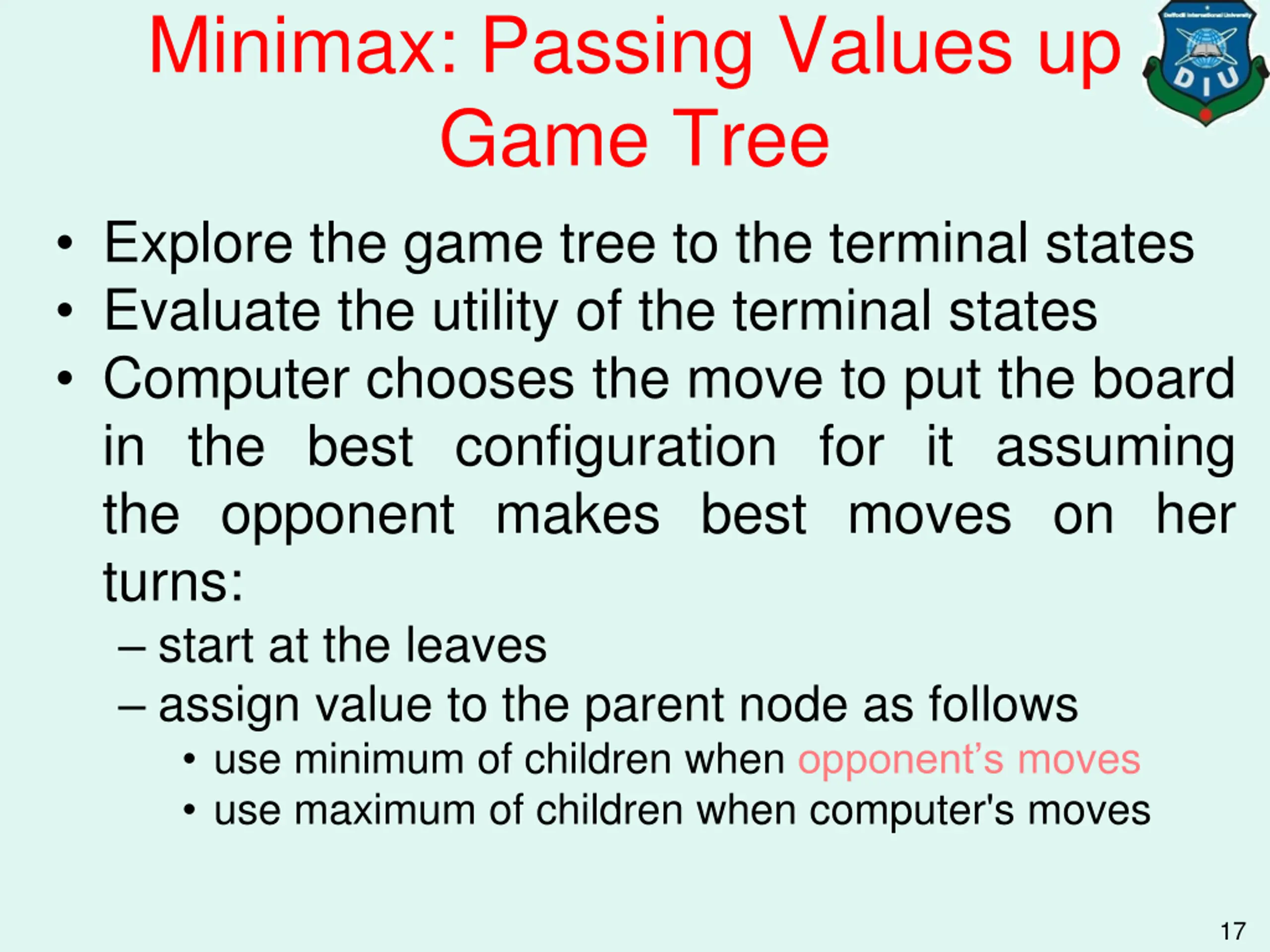 Minimax: Passing Values up Game Tree Explore the game tree to the terminal states Evaluate the utility of the terminal states Computer chooses the move to put the board in the best configuration for it assuming the opponent makes best moves on her turns: start at the leaves assign value to the parent node as follows use minimum of children when opponent s moves use maximum of children when computer's moves 17